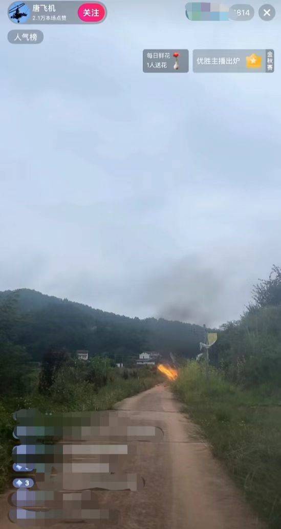 9月27日下午4时,李刚强刷到了“唐飞机”又在飞行直播,他还叫家人一起看。没想到,画面中飞机直直往下坠,坠落地点很快出现一团火球。“出事了,这时,直播间叫开了,有人喊打120求救,有人喊打110报警。”村干部打电话通知救人。