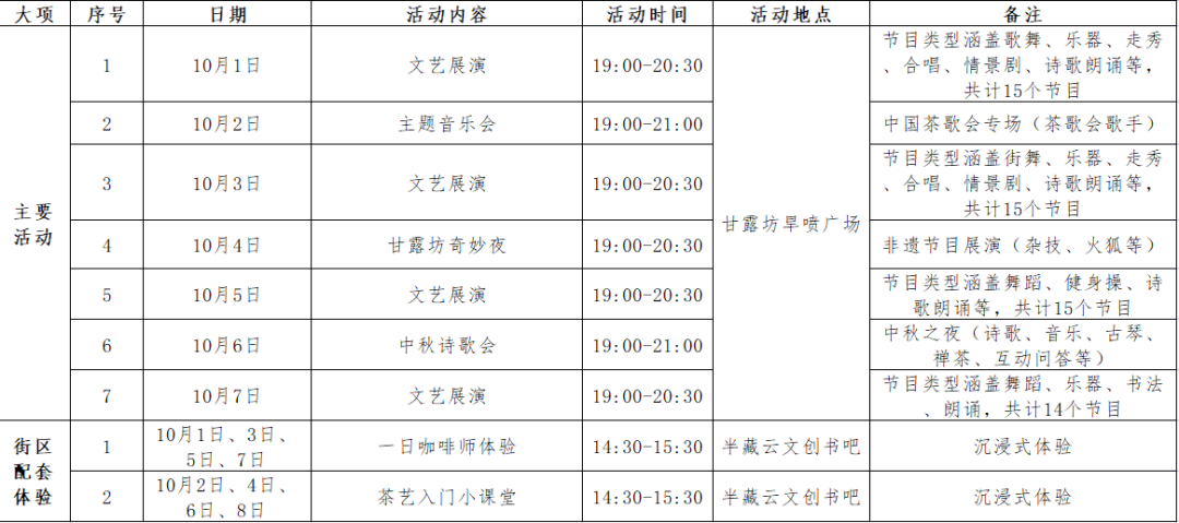 甘露坊特色街区依托茶马古道历史文化,已成为名山新地标。10月1日至8日,这里将举办4场群众性文化展演活动,包含歌曲、舞蹈、琴茶、走秀、朗诵等多种形式。