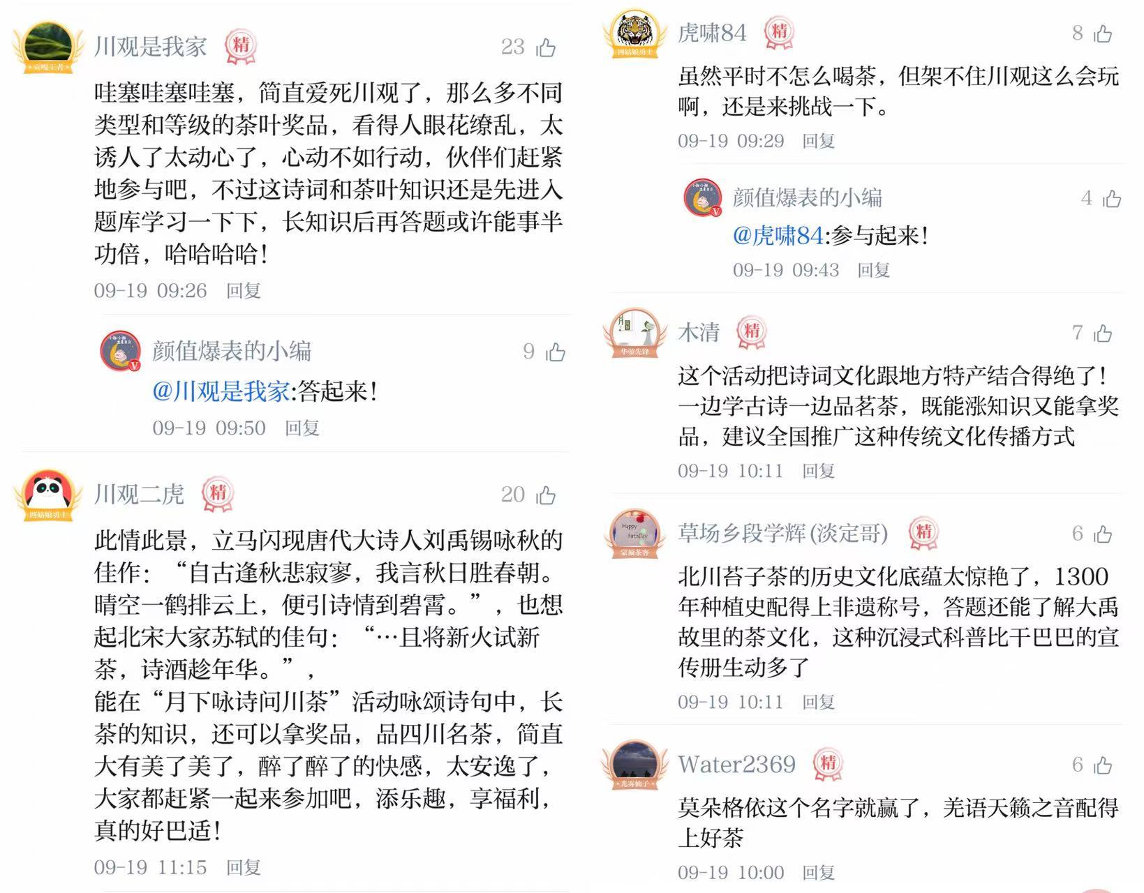 “巳巳如意 闯关有礼”蛇年中国传统节日互动第五站,“月下吟诗问川茶”中秋诗词大会,上线10天就掀起一场参与热潮——362572人次答题“闯关”,北川苔子茶的清香混着墨香飘满屏幕,诗词控、茶友集体“上头”!