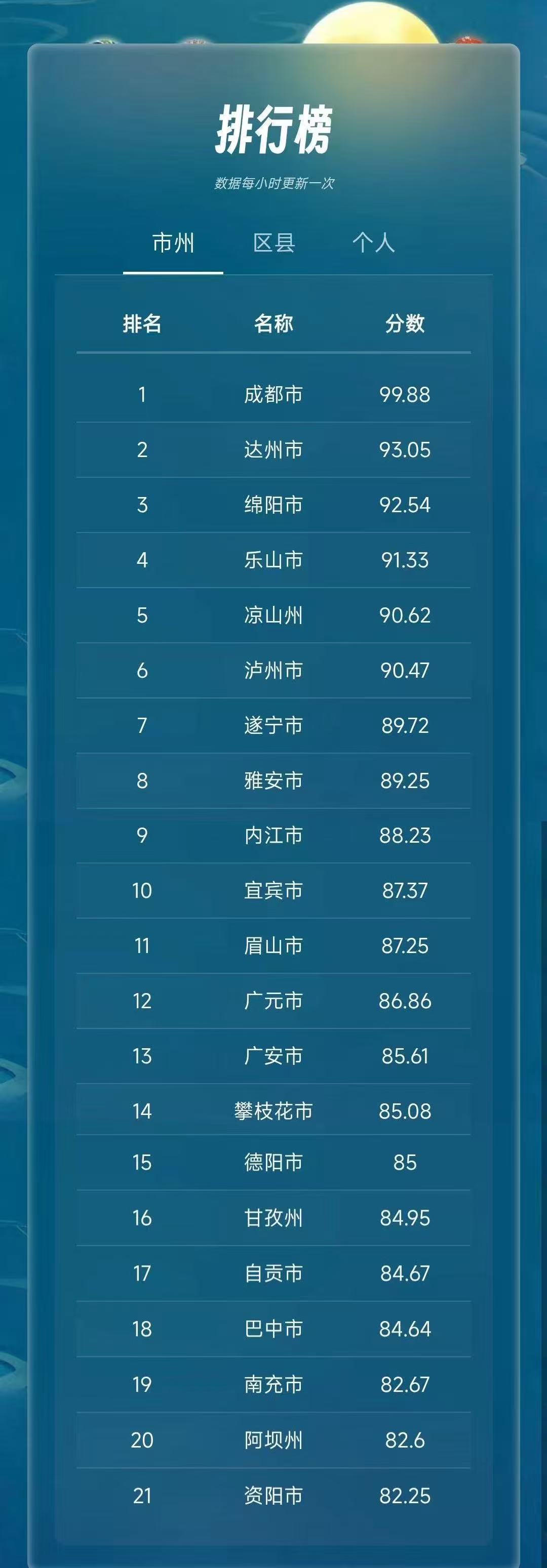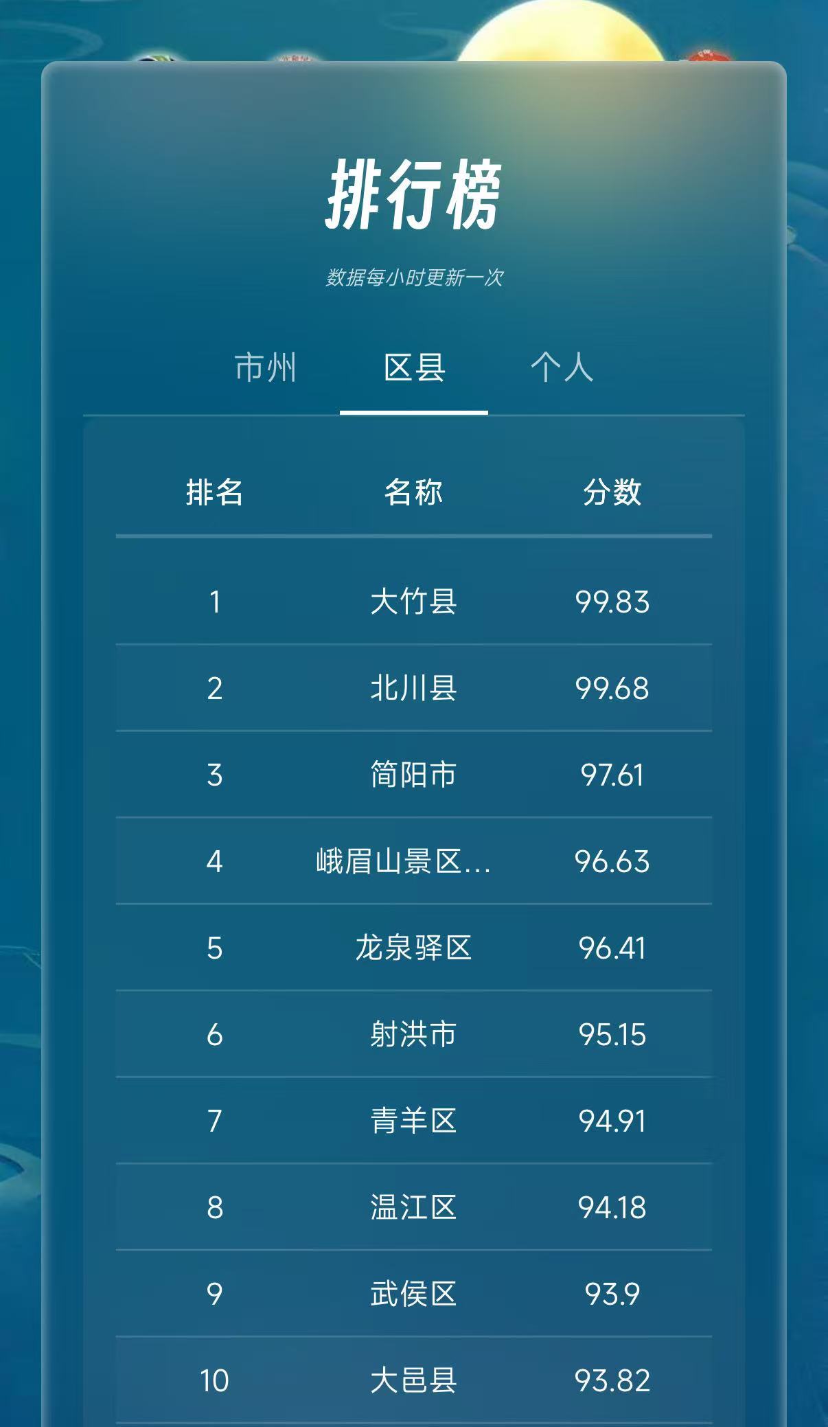 区县排名更成了“地域荣誉战”,在活动前期,北川羌族自治县一度以“东道主”优势领跑,但在经过一段时间“学习”后,大竹县厚积薄发,截至9月29日18时,以0.15分的微弱优势登顶区县排行榜。