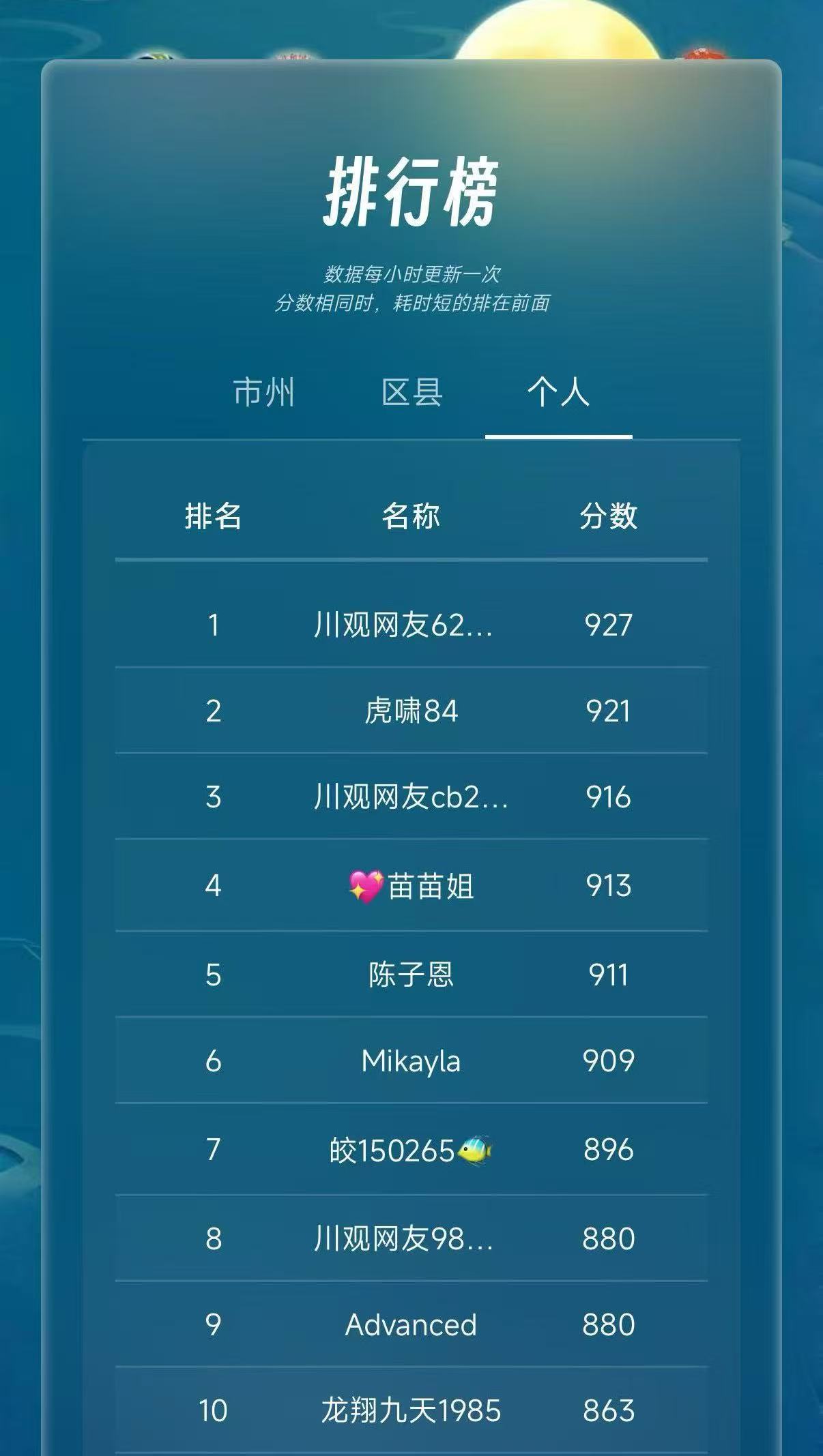 个人排行榜“神仙打架”,第1名与第2名仅差6分,前6名分差也极为接近,一场热身赛可能就改写排名。但也许靠一场极限赛5次复活机会“逆风翻盘”,登顶也说不定。截至9月29日18时,川观网友626657以927分暂列个人排行榜第一。