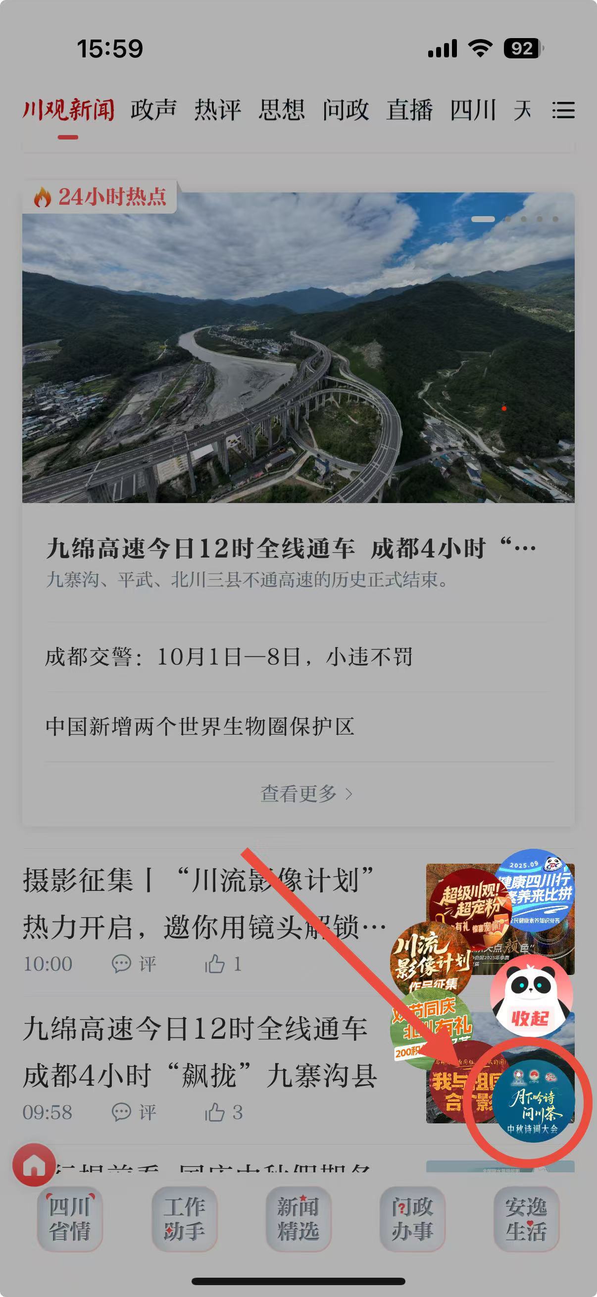 方式一:在川观新闻首页,点击右下方悬浮球,找到“月下吟诗问川茶”中秋诗词大会活动图片,点击即可参与;