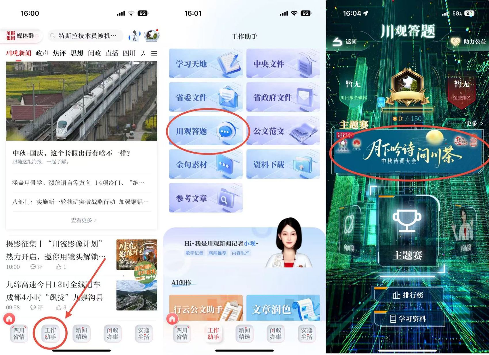 方式二:在川观新闻首页,点击下方“工作助手”,“川观答题”,找到“月下吟诗问川茶”中秋诗词大会活动图片,点击即可参与;