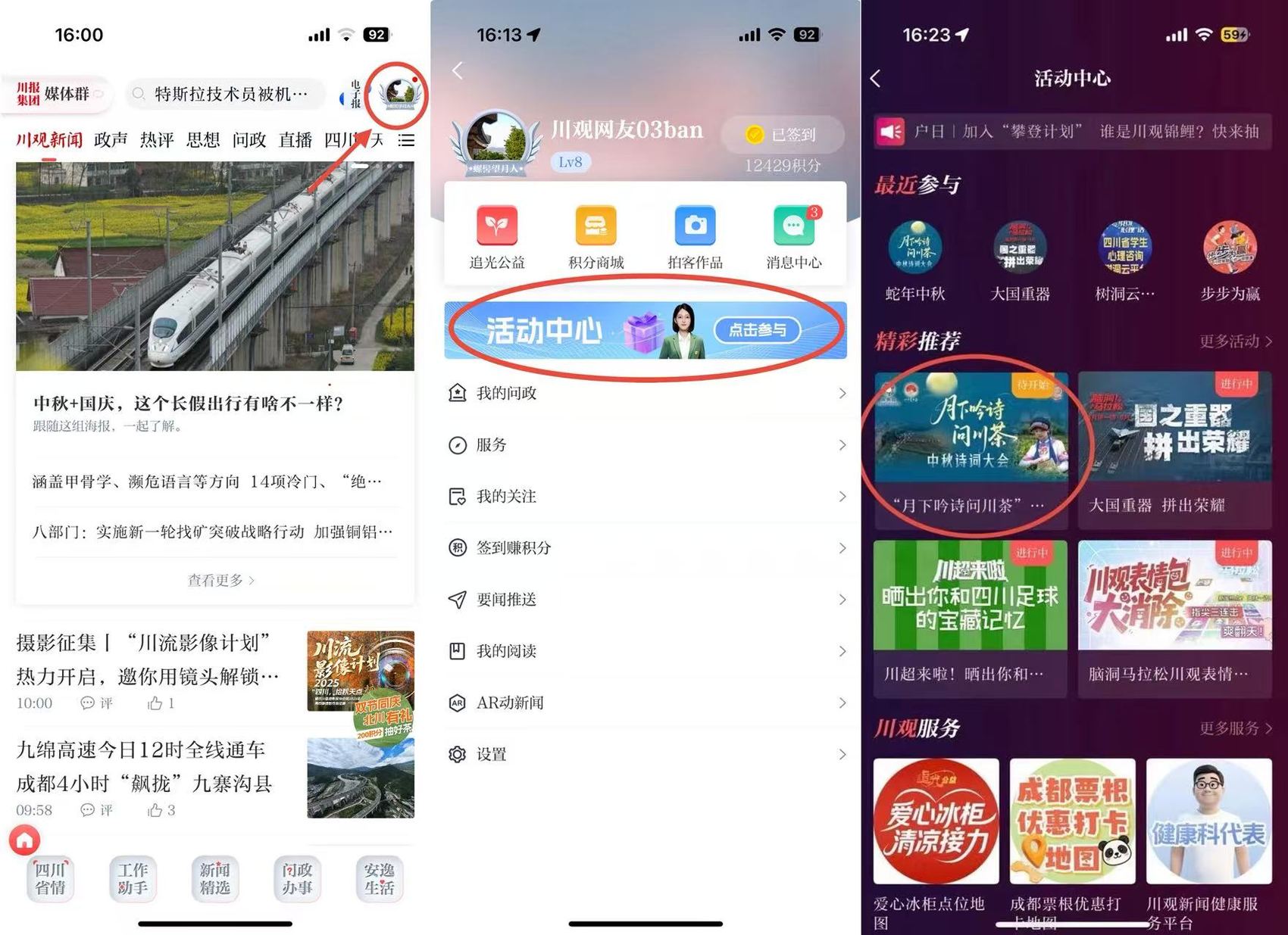 方式三:在川观新闻首页,点击右上角“我的”,点击“活动中心”,找到“月下吟诗问川茶”中秋诗词大会活动图片,点击即可参与;