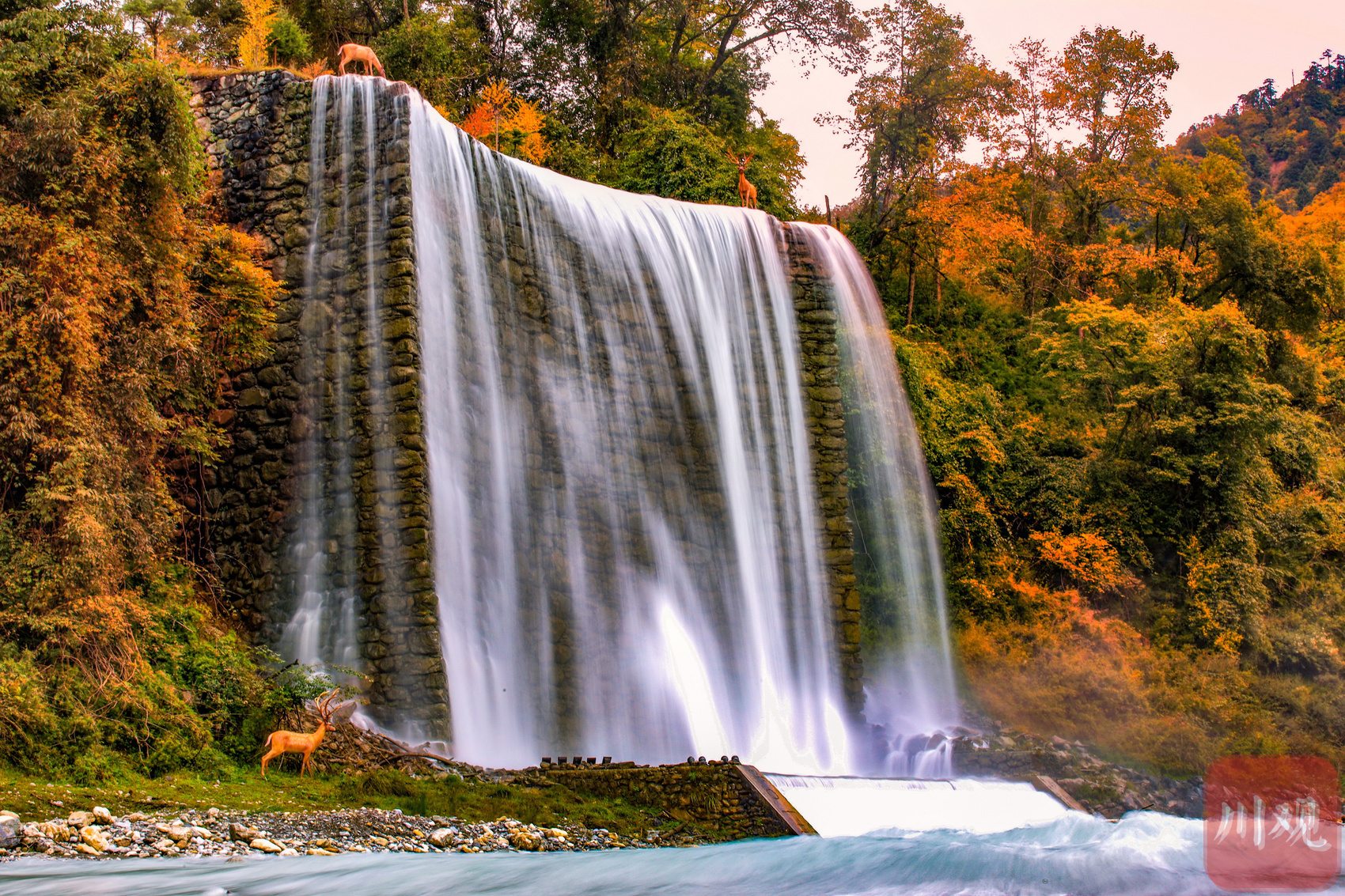 作为喇叭河的精华所在,西线是观赏彩林、邂逅野生动物的最佳路线。清晨,在索道下站附近,常能近距离看到小熊猫在枝头觅食,羚牛、水鹿群悠闲漫步,川金丝猴在树梢晒太阳。沿途还可欣赏海拔2400米的高山湖泊——鹿池,池水碧绿如镜,与周围渐变的彩林相映成趣。红石滩的橙色苔藓、青石板路上的鹿群足迹,更添几分秋日秘境之感。