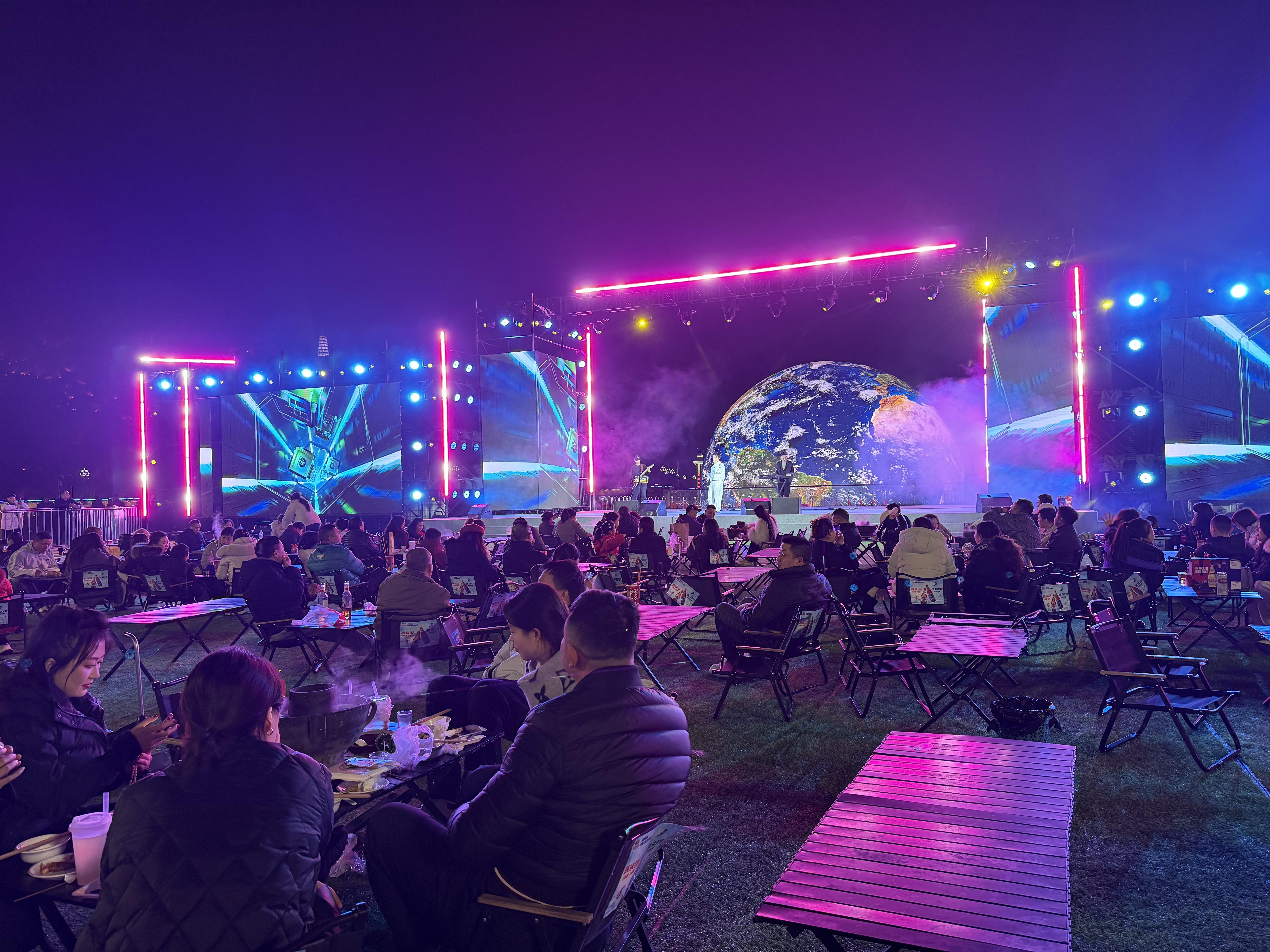 在宜宾市叙州区的央视秋晚拍摄地,9月27日晚,“长江首城·微醺派对”熊猫音乐嘉年华拉开帷幕,现场设置大屏幕直播四川省城市足球联赛,自贡对阵宜宾比赛正酣,游客们一边享受美酒美食,一边为比赛加油助威。