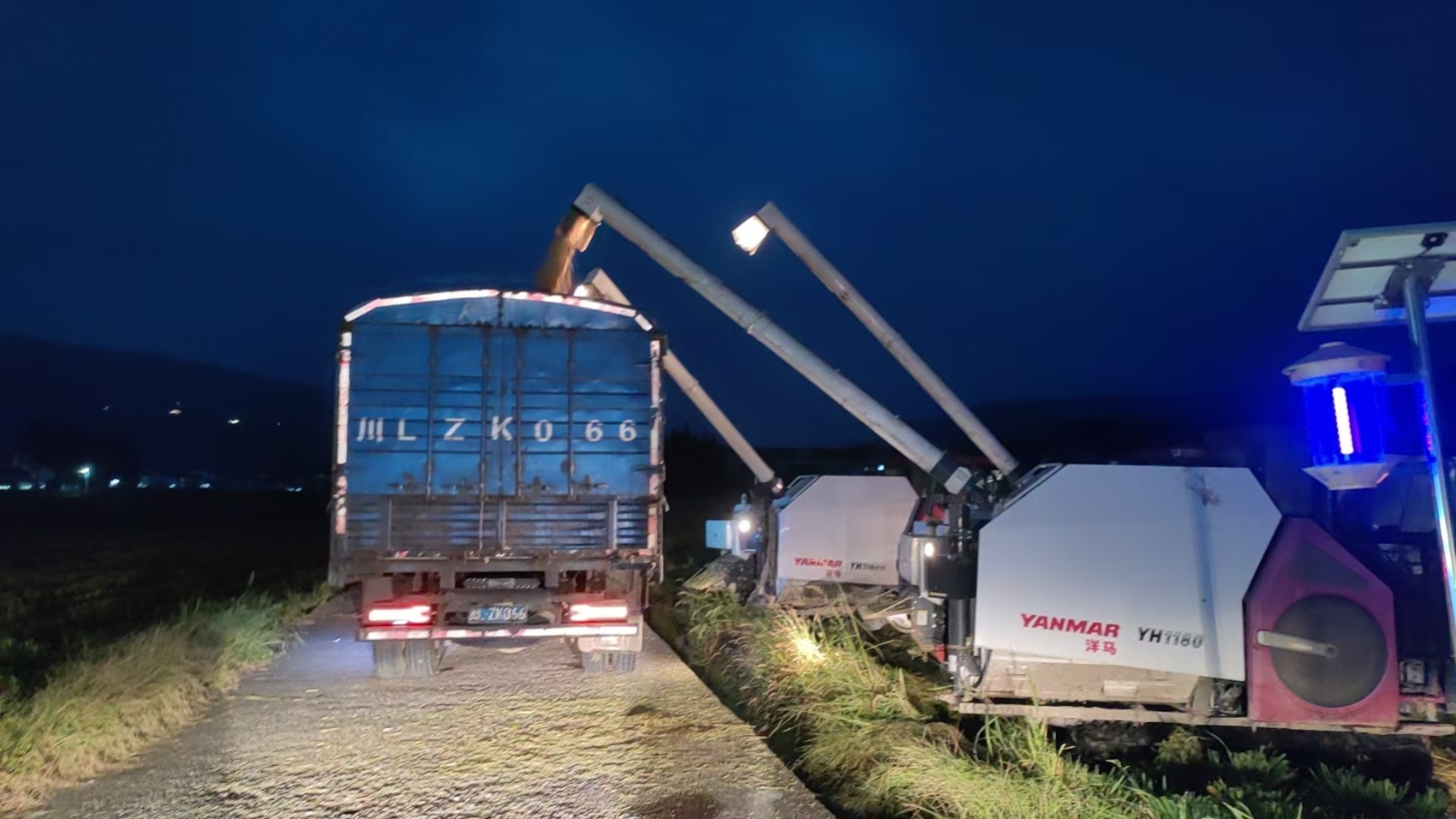 9月17日晚上8时许,乐山市夹江县,2台收割机在运粮车灯光的辅助照明下,在种粮大户经营的田地里抢收水稻。农机轰鸣声中,四川邦力达乐天农业服务有限公司副总经理邓鹏飞一边紧盯作业进展,一边用手机催促粮车加快转运。