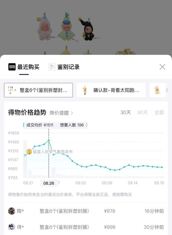 然而该情况在发售后出现了下滑,发售当日23时,记者在得物App上看到,毛绒端盒成交记录一直反复在600元左右上下波动,从数据曲线来看,端盒从9月22日的1070元持续走低跌至709元,其中隐藏款价格也从929元跌至717元,而真实成交记录在500-800元之间。