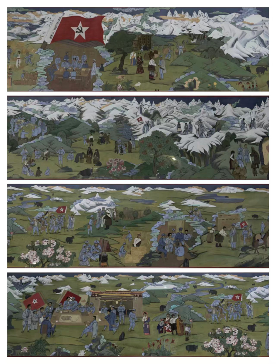 唐卡《红军长征在阿坝》作者:艺术群体 “这幅唐卡分为三个部分,总长16米,寓意红军长征在阿坝的十六个月,高70厘米,代表着建州70周年。”《红军长征在阿坝》唐卡总策划、总指导三郎罗尔伍,这幅唐卡聚集了各民族青少年共70多人义务参加创作,他们中有唐卡传承人、各学校美术老师,主要创作者则是中小学生,年龄从9岁到20岁不等。