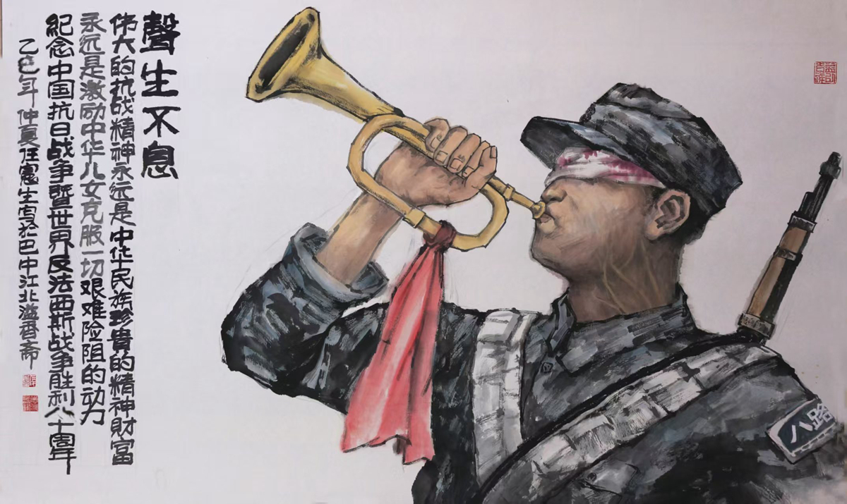 《声生不熄》作者:任宪生 以残躯与号角构建悲壮符号,水墨渍染中迸发精神不灭的永恒强音,在身体叙事与革命理想的张力间完成对抗战精神的崇高转译。