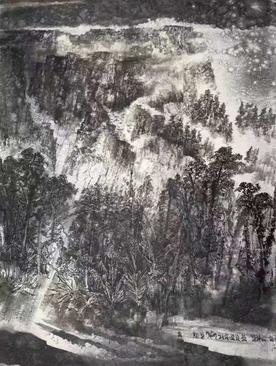 《雪落无声》作者:成都画院卢贞 夹金山作为红军长征途中翻越的第一座雪山,承载着厚重的历史记忆。画中那队人马正是当年红军战士的写照,他们在恶劣的自然环境中坚定前行,体现出顽强的意志和无畏的精神。通过这幅画作,将自然景观与历史情怀相融合,唤起观者对那段峥嵘岁月的追忆,同时也传达出对大自然神奇力量的赞叹之情。