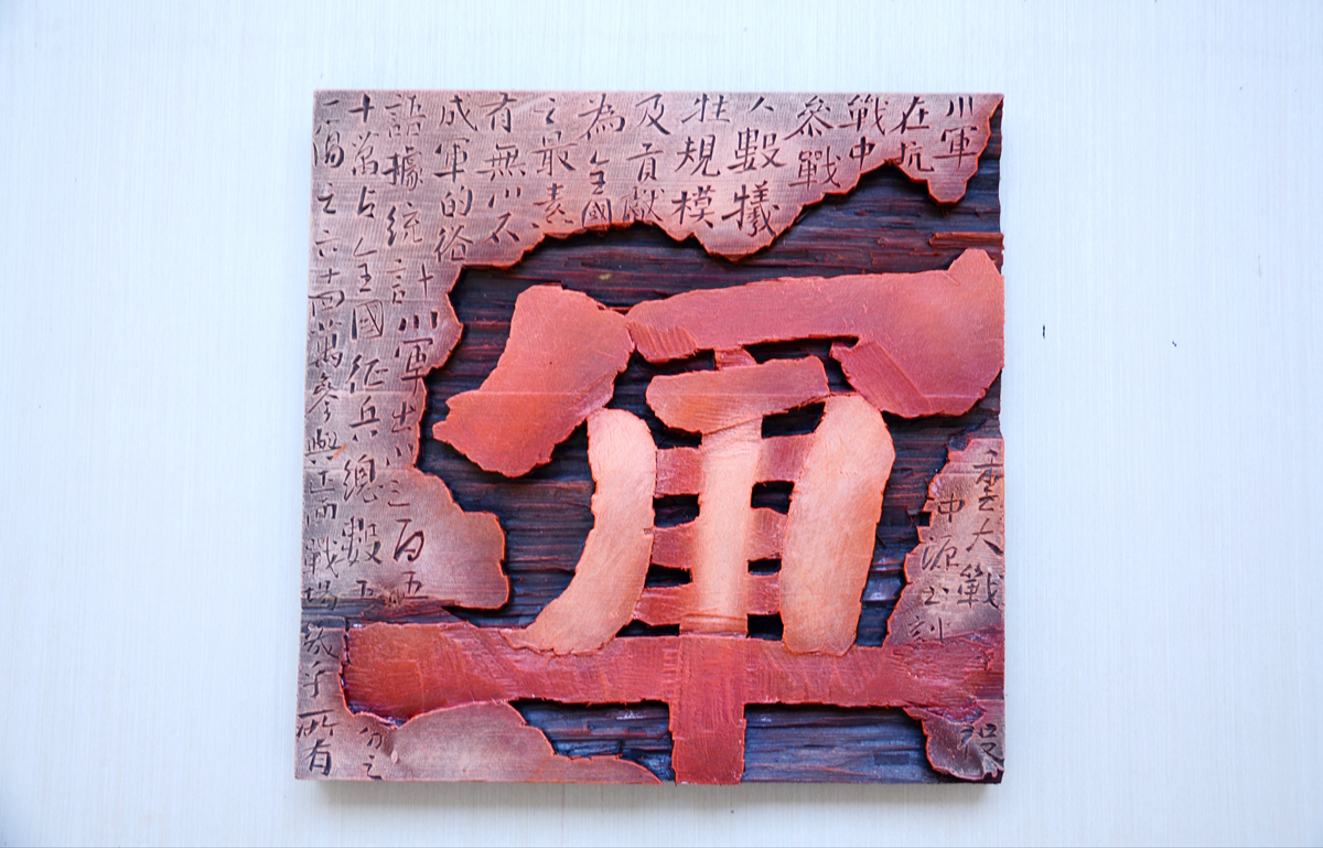 书刻《无川不成军》作者:罗中源 以川军为主要内容,川军在抗战中参战人数牺牲规模及贡献为全国之最,素有无川不成军的说法,据统计川军出川抗战350万,占全国征兵总数5分之1,伤亡64万,参与了正面战场几乎所有的重大战役。本作品以军字为主体,重点突出中间三个竖画,将川字与军字融为一体,以体现无川不成军的主题。