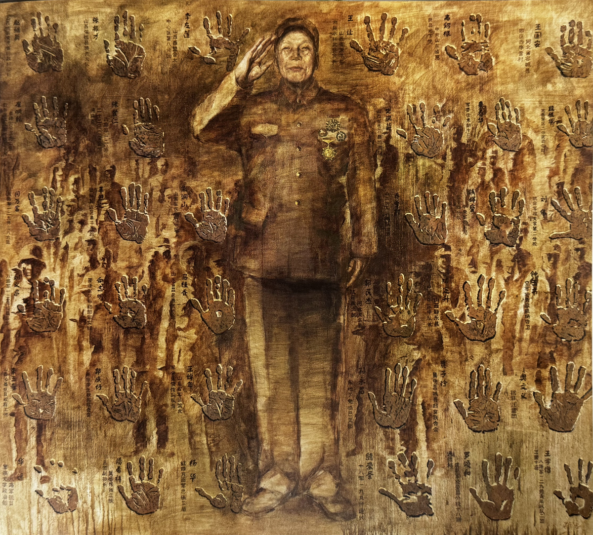 油画《老兵》作者:张国忠 作品表现了一位抗战老兵的精神风貌,他的背后是抗战老兵们留下的手印,作品现存建川博物馆,并被该馆收藏。