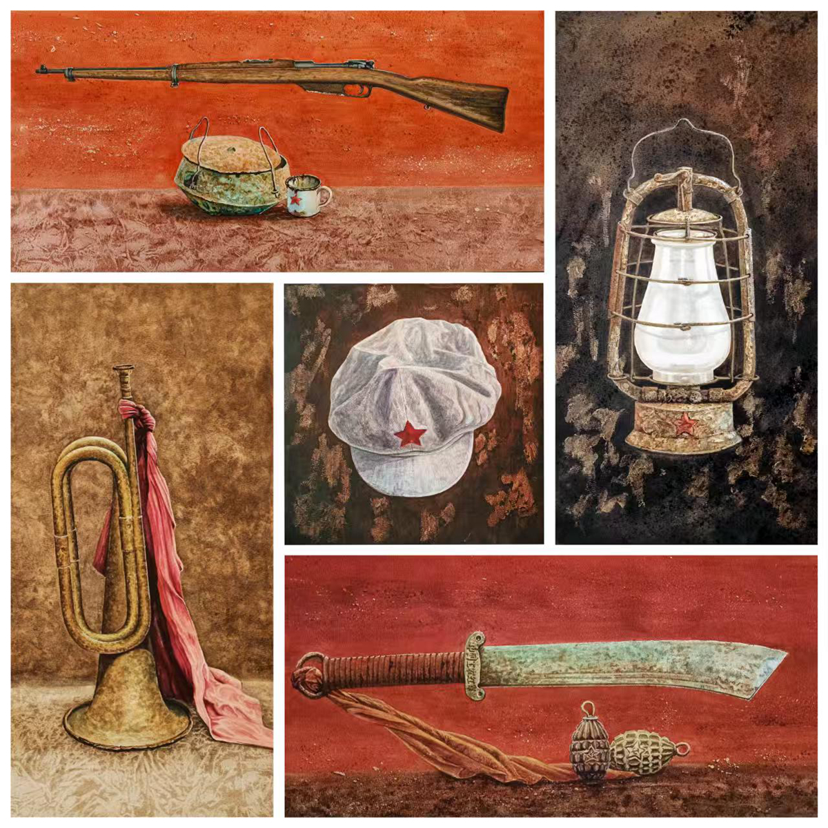 水彩画《光辉岁月》作者:王庆九 为歌颂党的丰功伟绩、传承伟大长征精神,自己查阅大量资料,从红军使用过的物件入手,以写实、组构的方式,定格艰难而光辉的岁月,意在引人抚今思昔、铭恩奋进。