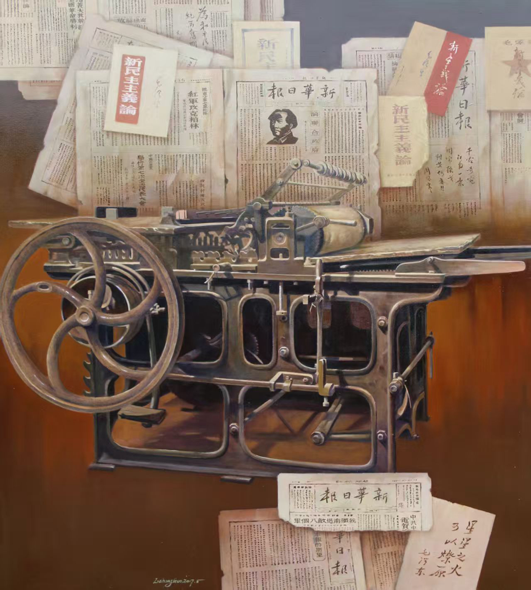 《余音犹存》作者:李昌国 画面主体是一台陈旧的印刷机(现陈列在国家博物馆),它安静地伫立着,却仿佛在诉说往昔的峥嵘岁月。这台印刷机承载着抗战时期的重要使命。曾经它印刷过《新华日报》,也印刷过毛泽东同志的文章,让革命思想得以广泛传播 ,是那个战火纷飞年代的关键见证者。