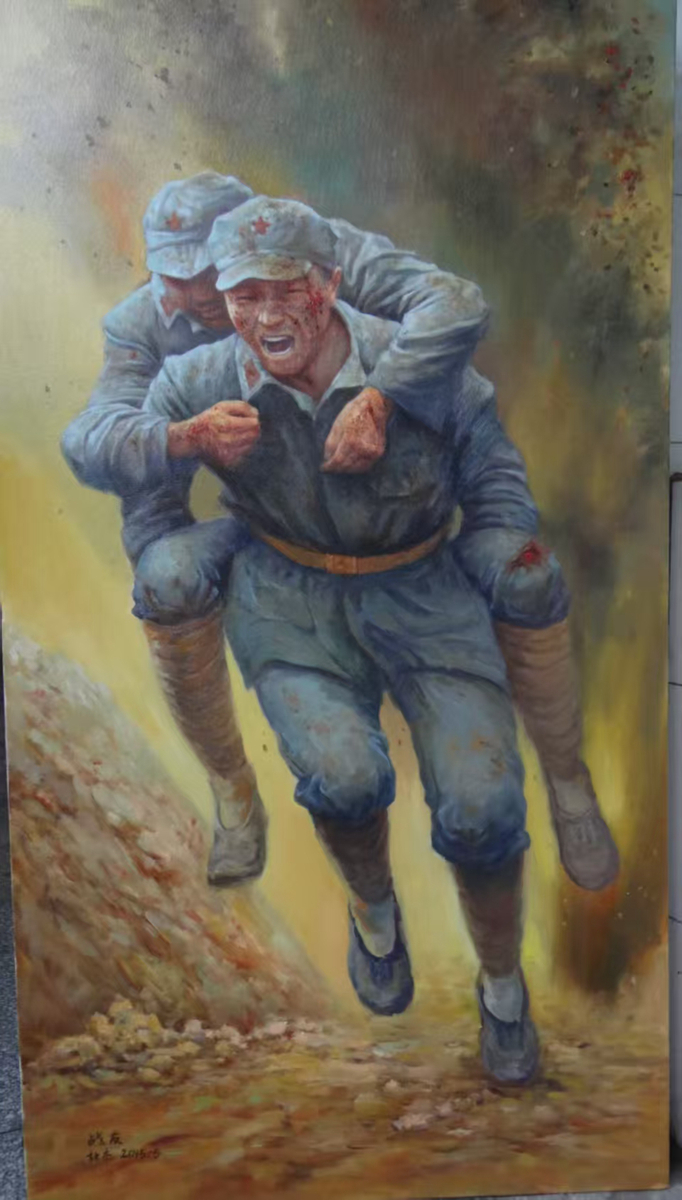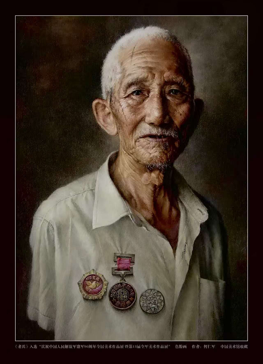 《老兵》作者:何仁军 形象是中国抗战军人的典型代表,幸存的老兵包经战争的风霜,全民抗战的烽火是惨烈的,老兵失去双臂,额头脸部都留下刀痕,三枚勋章反映国共合作,为和平而战,画面通过老兵肖像反映了中国军人不折不挠的民族精神。