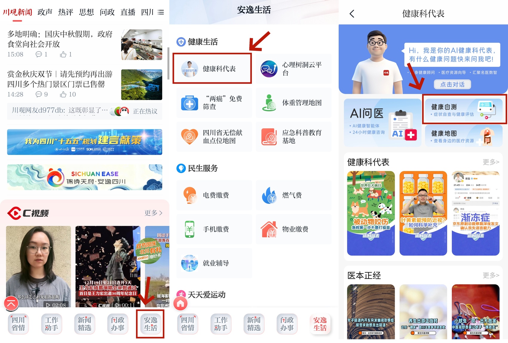 点击首页右下角【安逸生活】-【健康生活】,找到【健康科代表】,点击进入川观新闻健康服务平台——“健康科代表”。点击【健康地图】,即可进行查询。