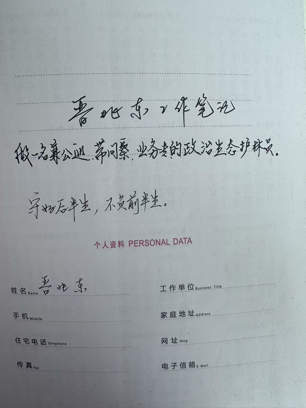 晋兆东在笔记本扉页上写下“守好后半生,不负前半生”的格言。