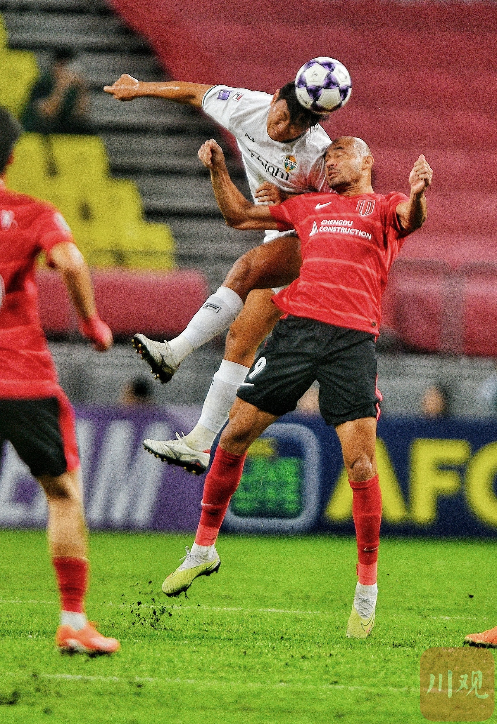 成都蓉城队员费利佩(红衣)与对方球员争头球。
