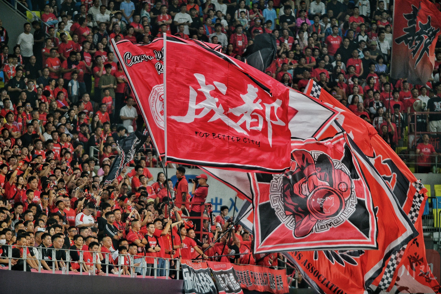 成都蓉城队员周定洋赛后挥舞“雄起”大旗。