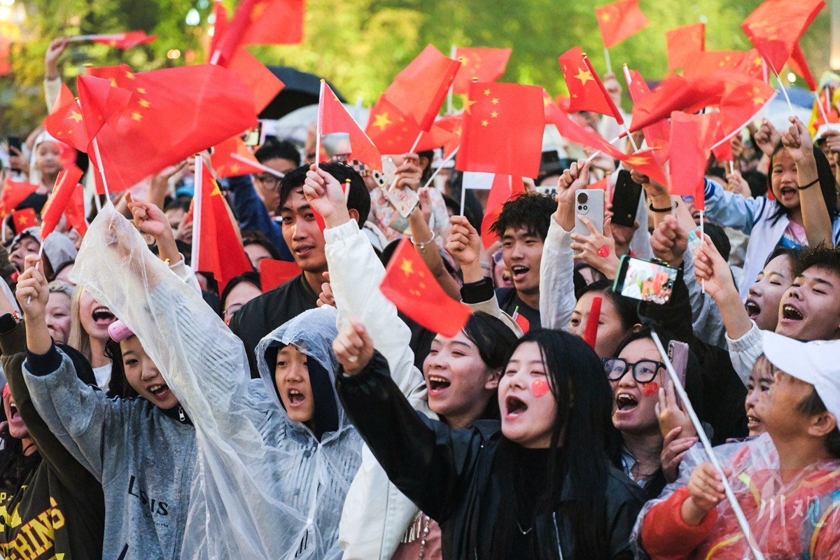 10月1日清晨,天空下起了小雨,但成都天府广场却洋溢着热烈的节日氛围,数万名市民和游客齐聚,冒雨观看升国旗仪式,庆祝新中国成立76周年。