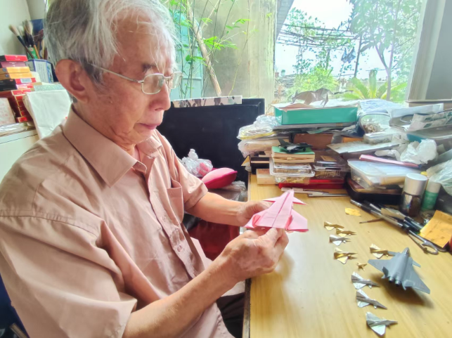 这些形态各异的“宝贝”,也跟着他走进了上百所学校、社区。他记得那个七岁小男孩成功折出飞机时,眼里倏然亮起的光;也记得在央视演播厅,将自己折的飞机赠给空军飞行员时,对方那一声郑重而温暖的“谢谢”。