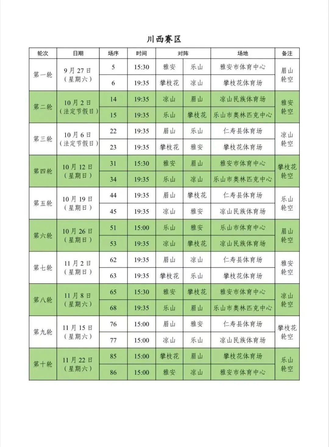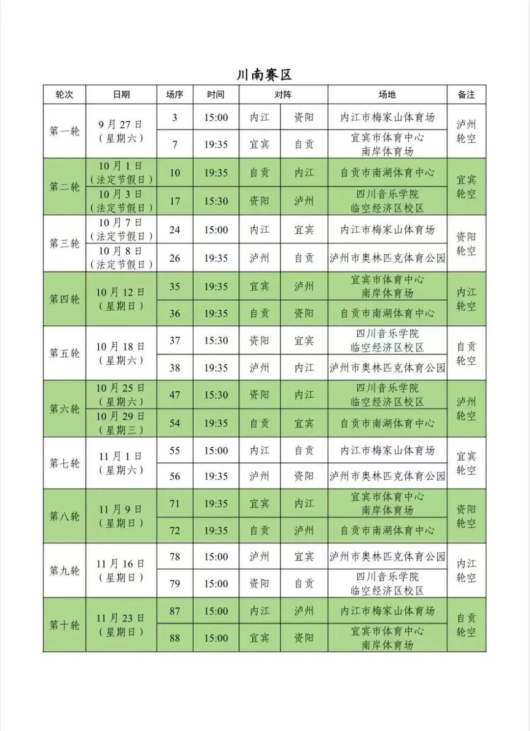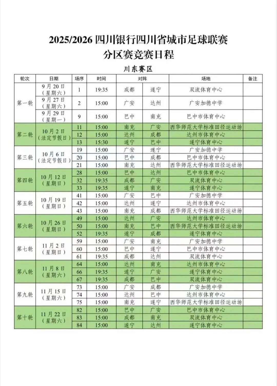 根据本赛季“川超”联赛的赛程安排,10月1日,自贡队在自贡市南湖体育中心迎战内江队,将拉开这个国庆中秋“双节”假期的“川超”大赛序幕。10月2日,川东赛区将迎来三场精彩对决。其中,达州与成都的两强相争尤其引人注目。而在同一天,川西赛区,凉山队主场与眉山队、乐山队主场与攀枝花队的比赛,同样不容错过。