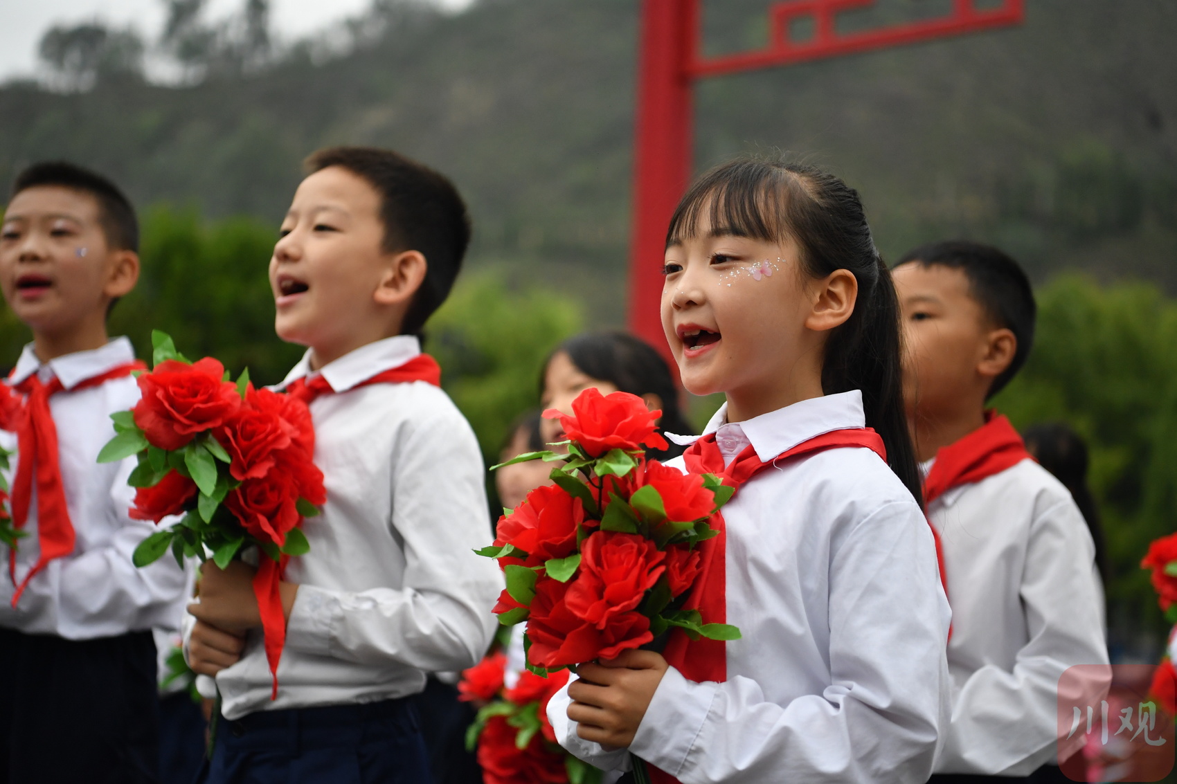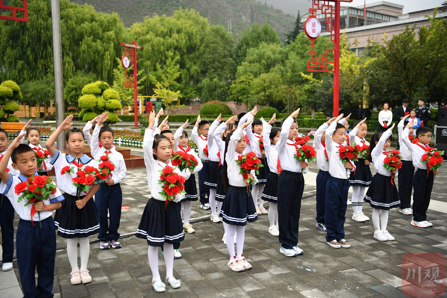 在汶川县新时代文明实践广场,学生参加升国旗仪式。