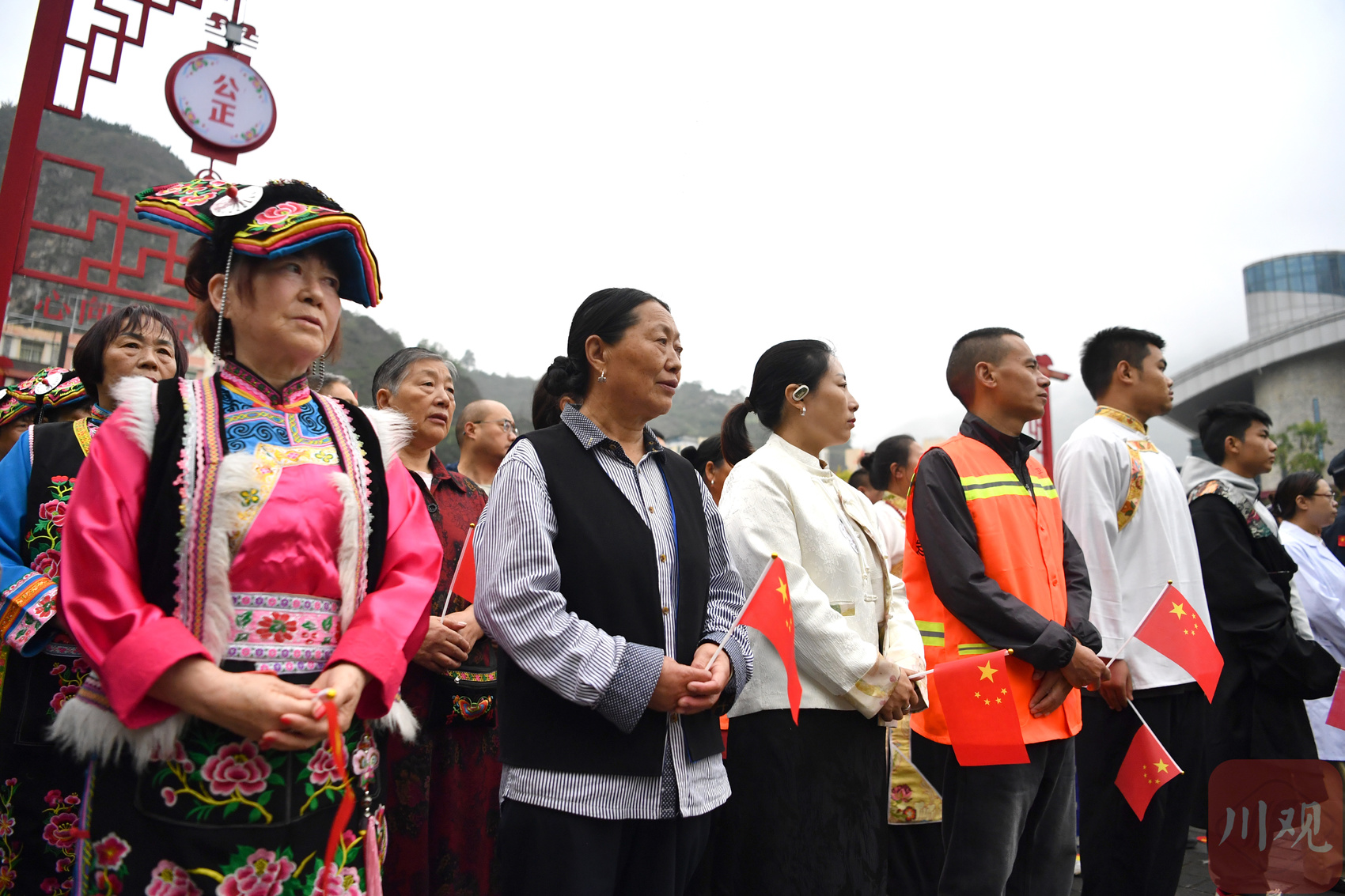 在汶川县新时代文明实践广场,各界代表参加升旗仪式。