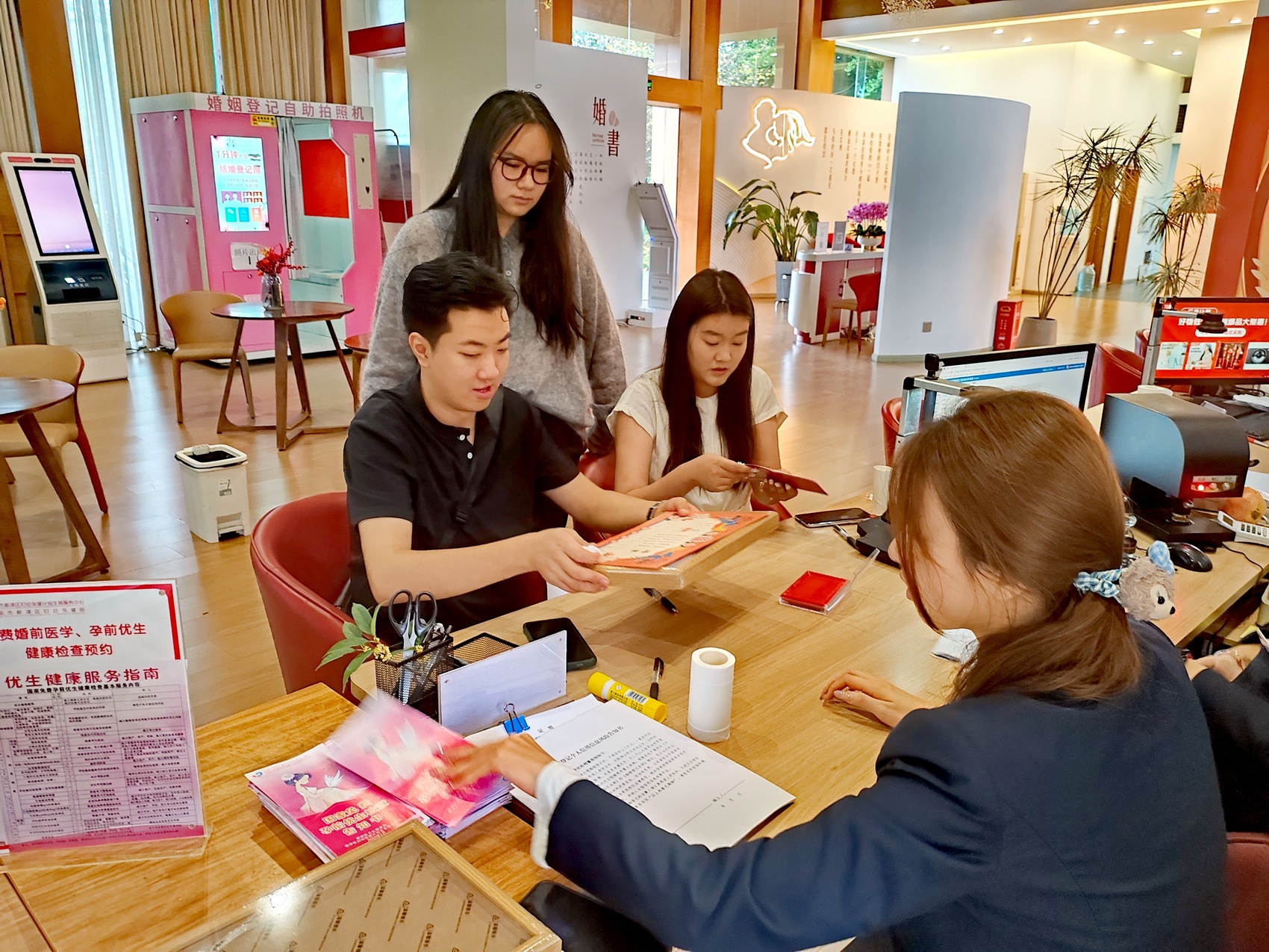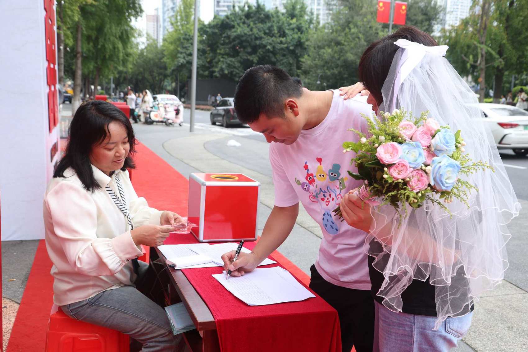 另一名新人李凤丽对成都的定制版“婚书”赞不绝口,“本以为假期办不了,没想到成都的延时服务这么贴心,工作人员耐心周到,让我们能从容地安排这个重要时刻。”