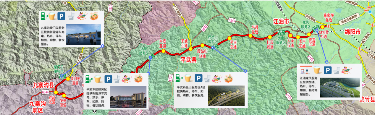 其中,江油龙凤服务区提供加油、热水、停车、如厕服务,并开放临时商超;平武药丛山服务区提供热水、超市、停车、如厕服务;平武木座服务区提供充电、热水、停车、如厕、购物、餐饮服务;九寨沟柴门关服务区提供充电、热水、停车、如厕、购物、餐饮服务。