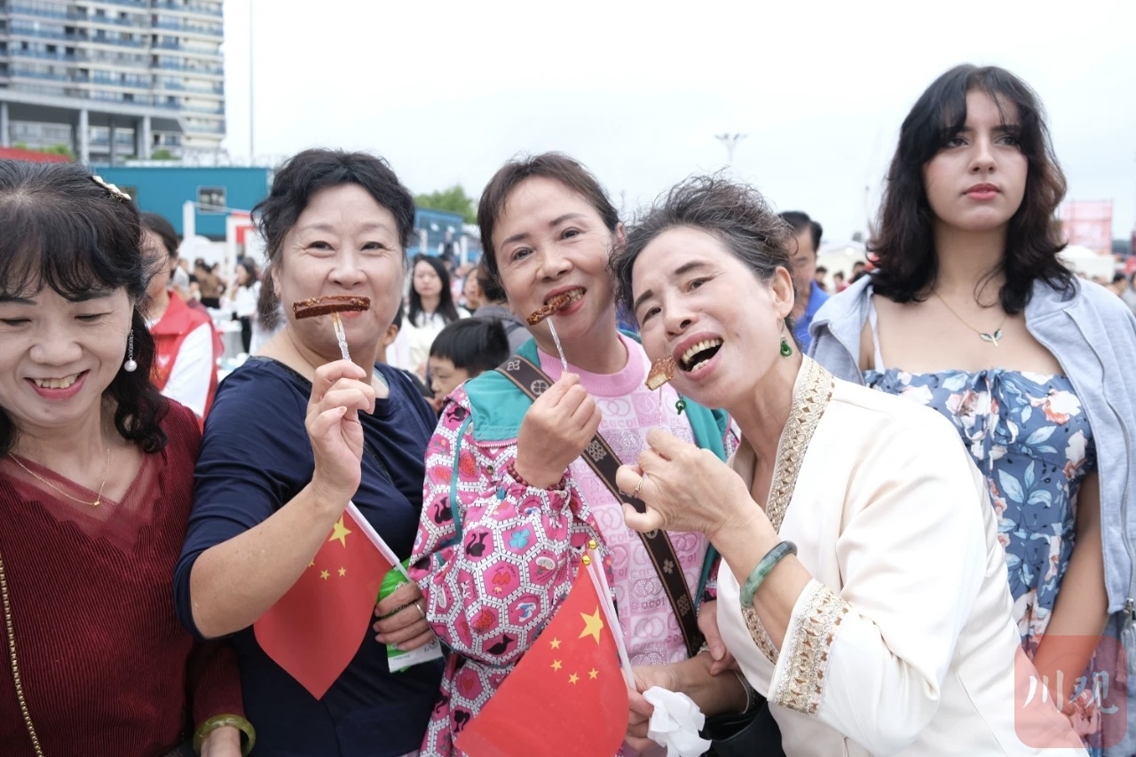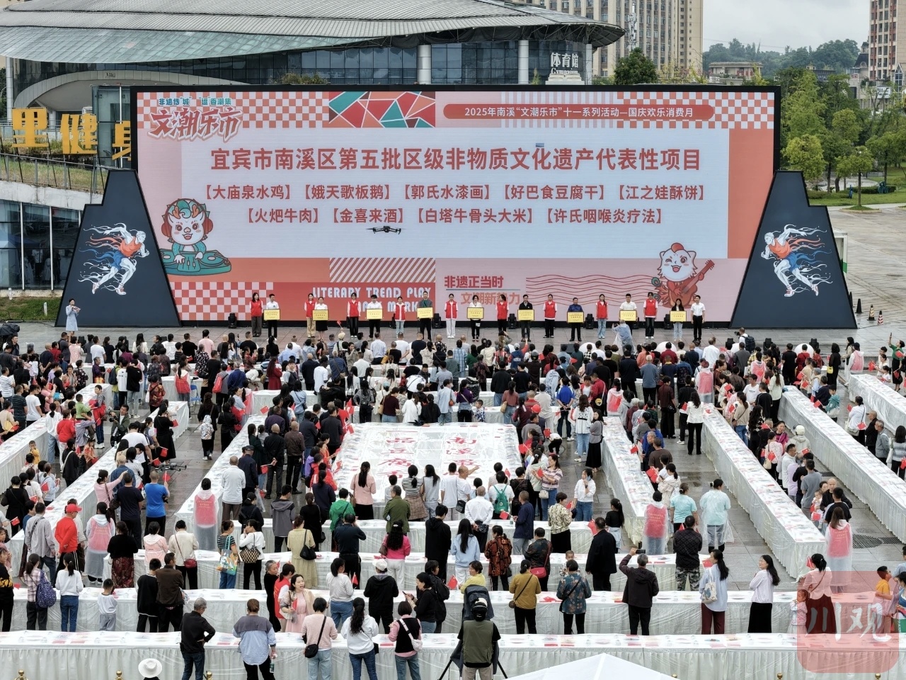 10月1日,2025年南溪“文潮乐市”十一系列活动——非遗传“城”“逗”香潮集国庆欢乐消费月活动暨“一品豆腐香·南溪最宜宾”万人共品豆腐干非遗体验活动启动仪式在仙源广场举行,现场汇聚万名市民游客,共同品鉴省级非物质文化遗产“南溪豆腐干”的独特风味。