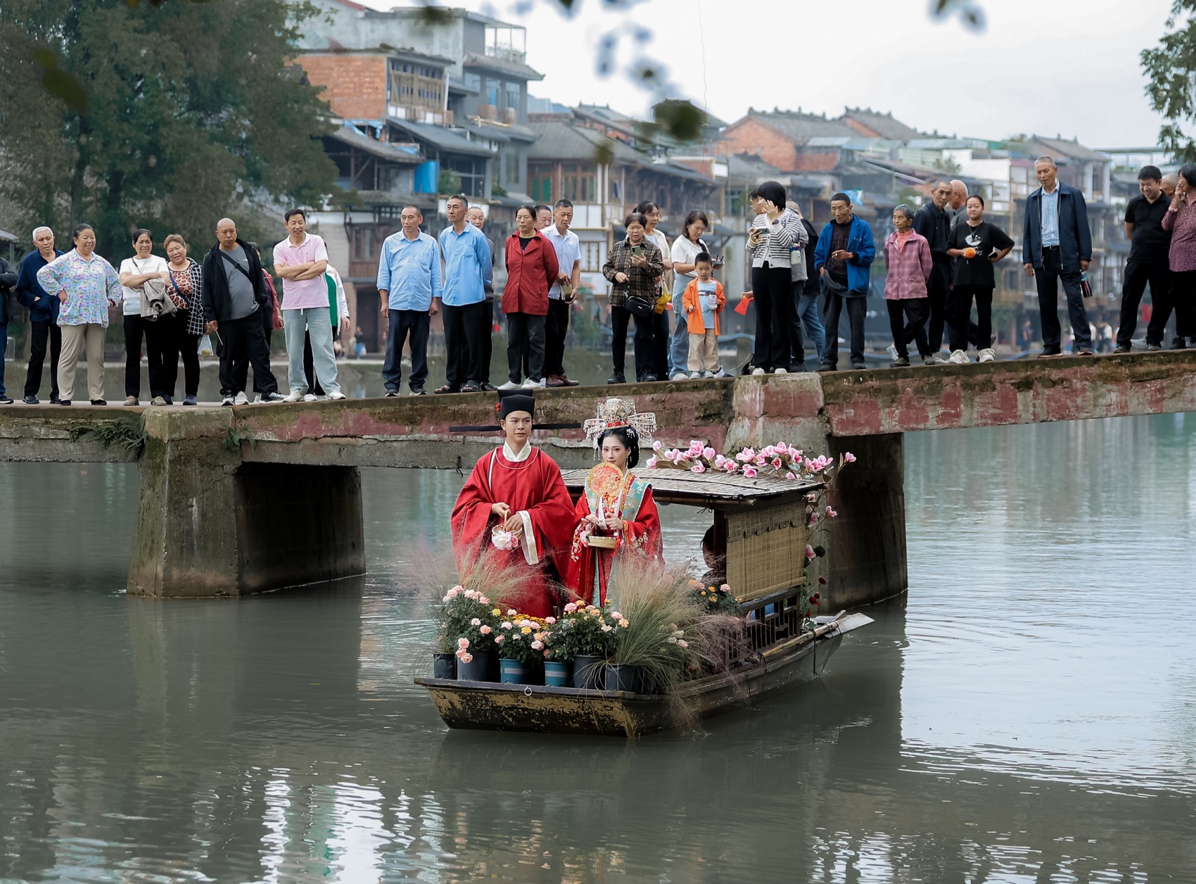 10月1日,邛崃市夹关镇举行的白沫江畔特色水上婚礼。