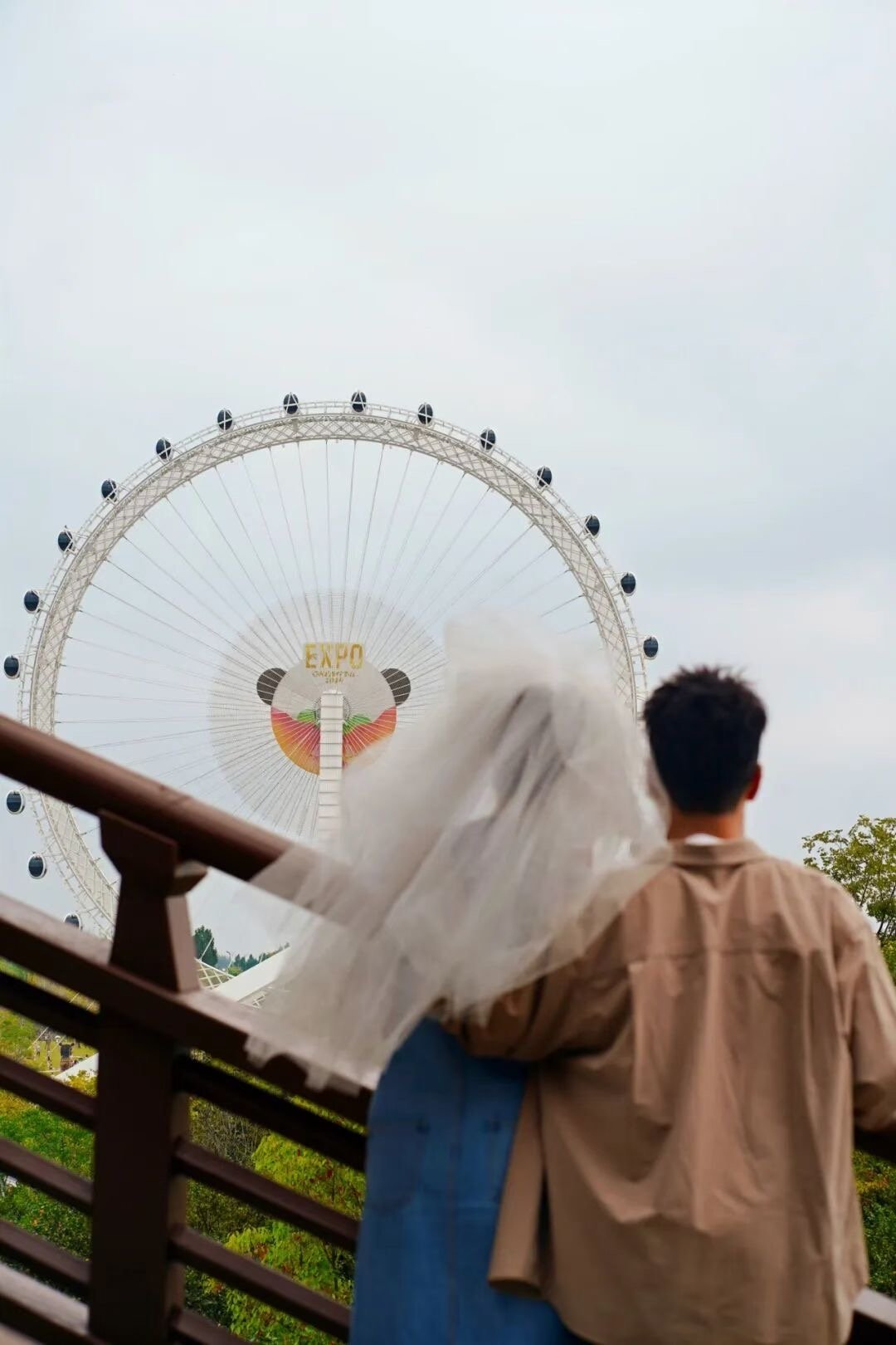 10月1日下午,新人在成都世博园与摩天轮合影。