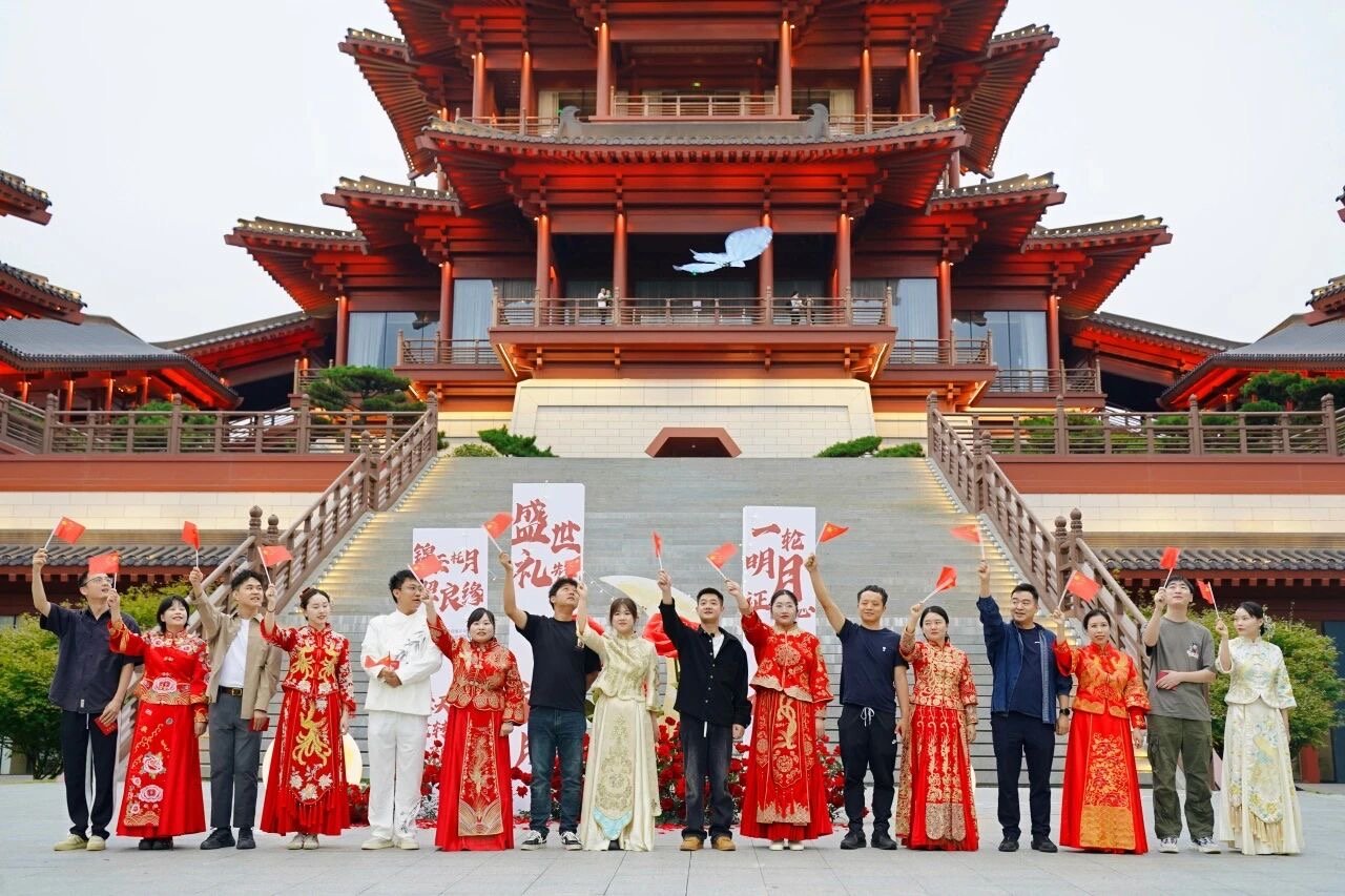 当天下午,包括他们在内的8对新人,在锦云楼众多市民游客的见证下,按照中式传统婚礼制式行出阁礼,体验了传统文化与中式礼仪的甜蜜浪漫。