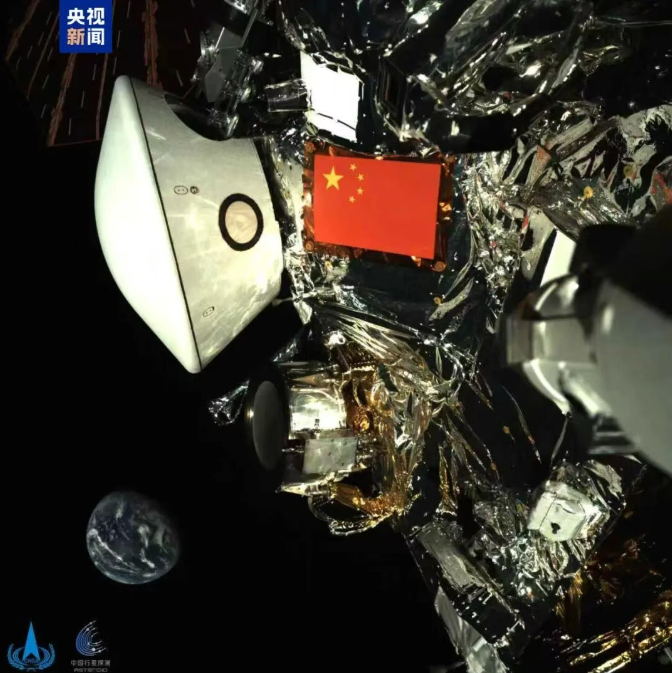 ▷1日,国家航天局发布了行星探测工程天问二号任务探测器在轨飞行期间获取的探测器与地球合影图像,探测器上的五星红旗与地球同框。