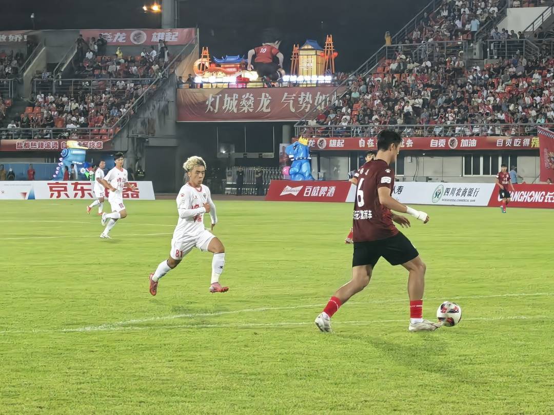 10月1日,2025/2026四川银行四川省城市足球联赛自贡队主场迎战内江队。上半场前半个小时,自贡队组织近20次进攻,多次射门。内江队组织数次进攻。上半场28分35秒,自贡队获得角球机会,5号球员狮子甩头,成功破门,比分来到1:0。主场球迷全场欢腾,为自贡队加油。