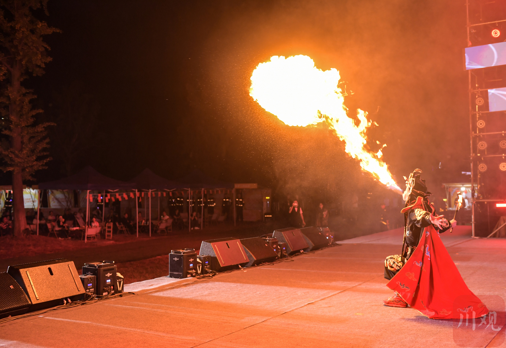 2025年10月1日晚,在成都新都高新技术产业园区沐光森林营地,川剧变脸演员在“成都新都区第二届银杏林下音乐嘉年华”活动中表演吐火。