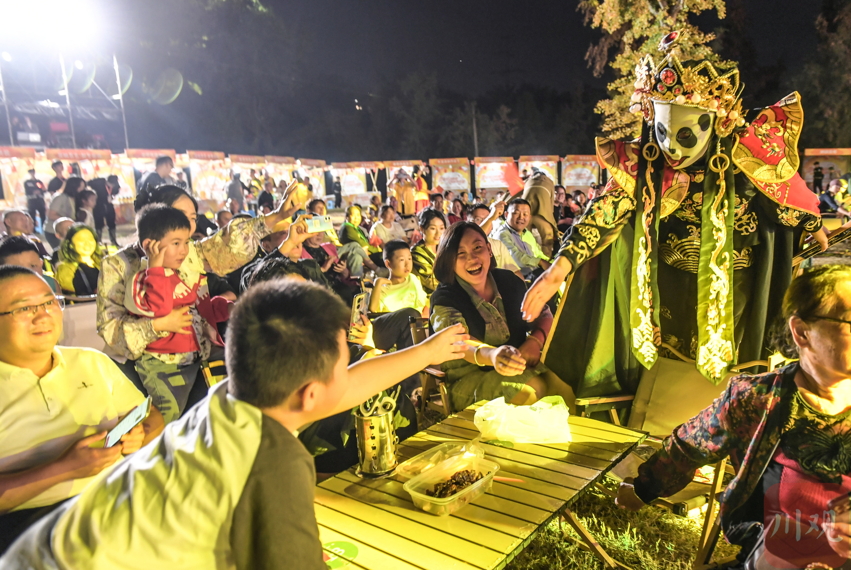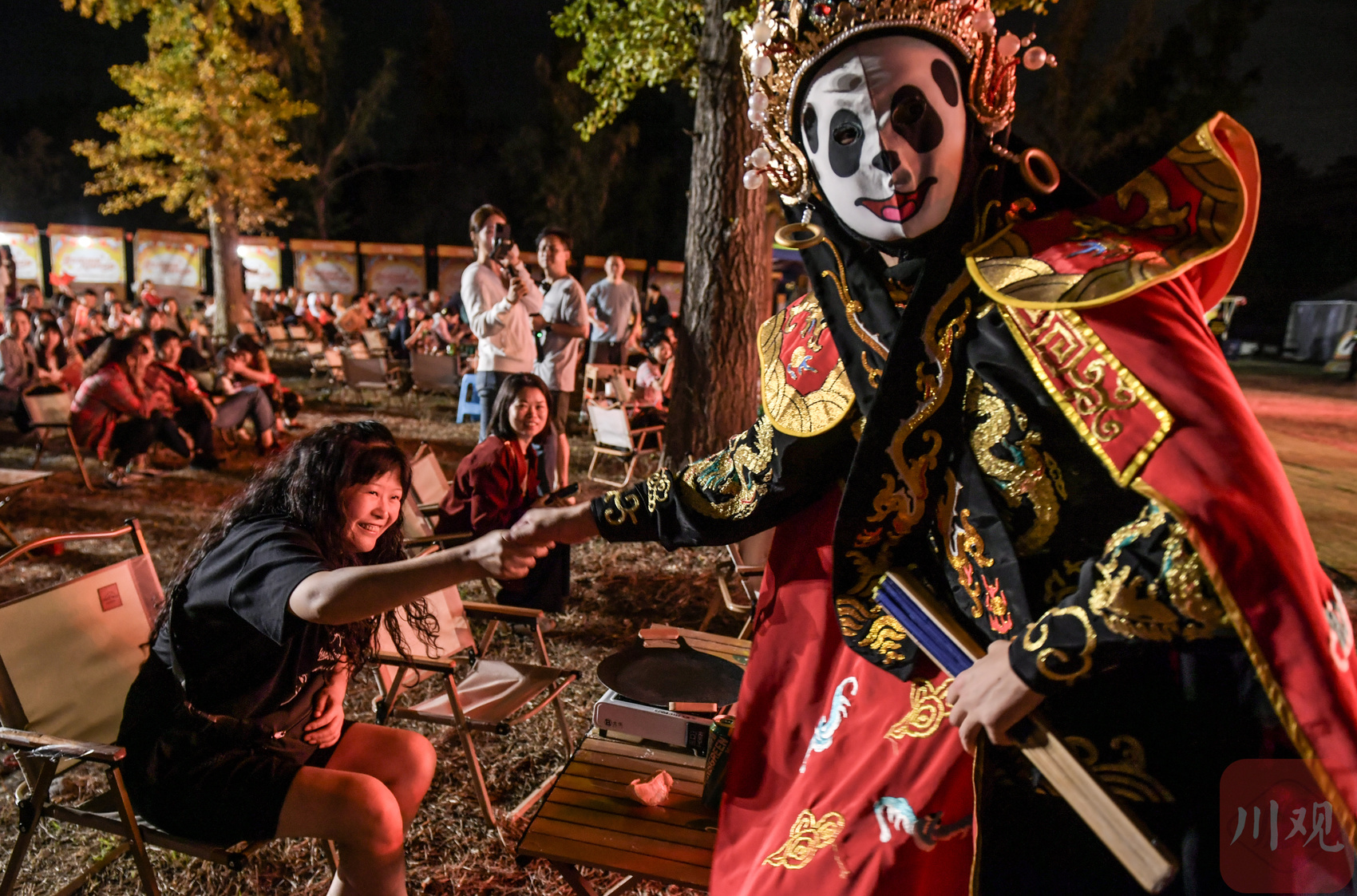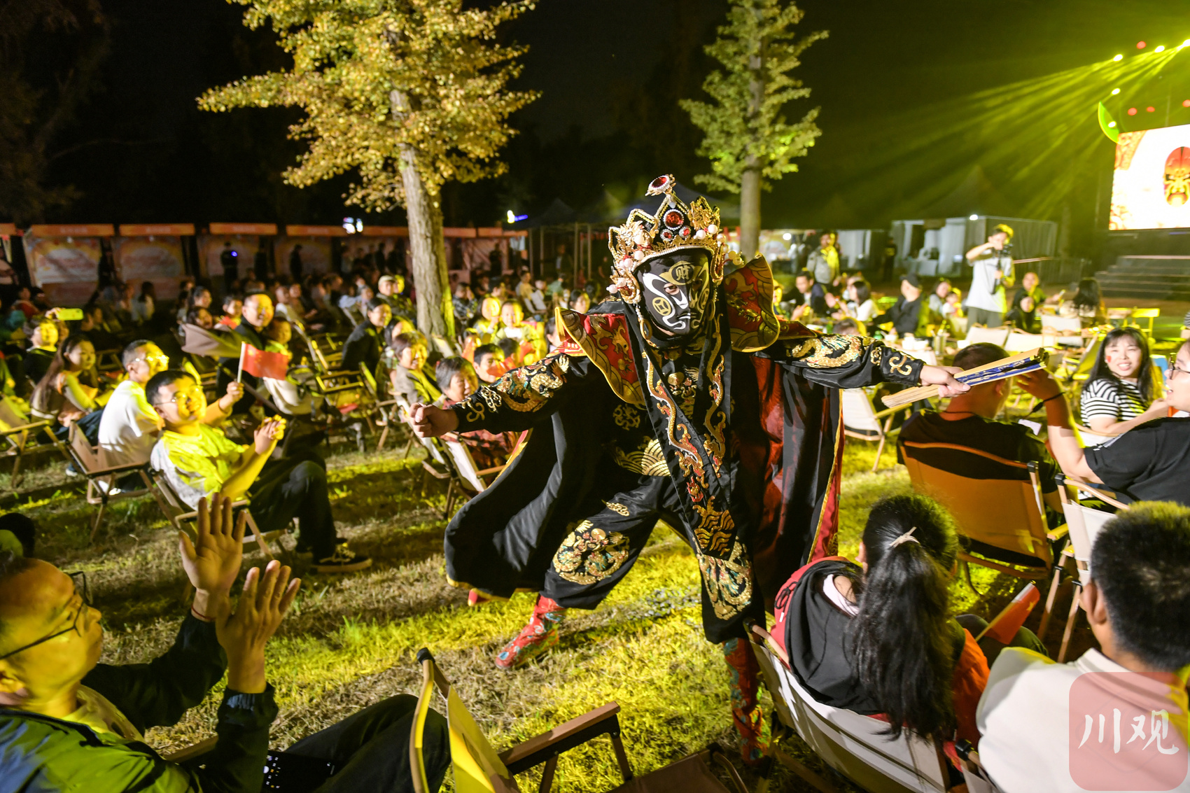 2025年10月1日晚,在成都新都高新技术产业园区沐光森林营地,川剧变脸演员在“成都新都区第二届银杏林下音乐嘉年华”活动中表演变脸。