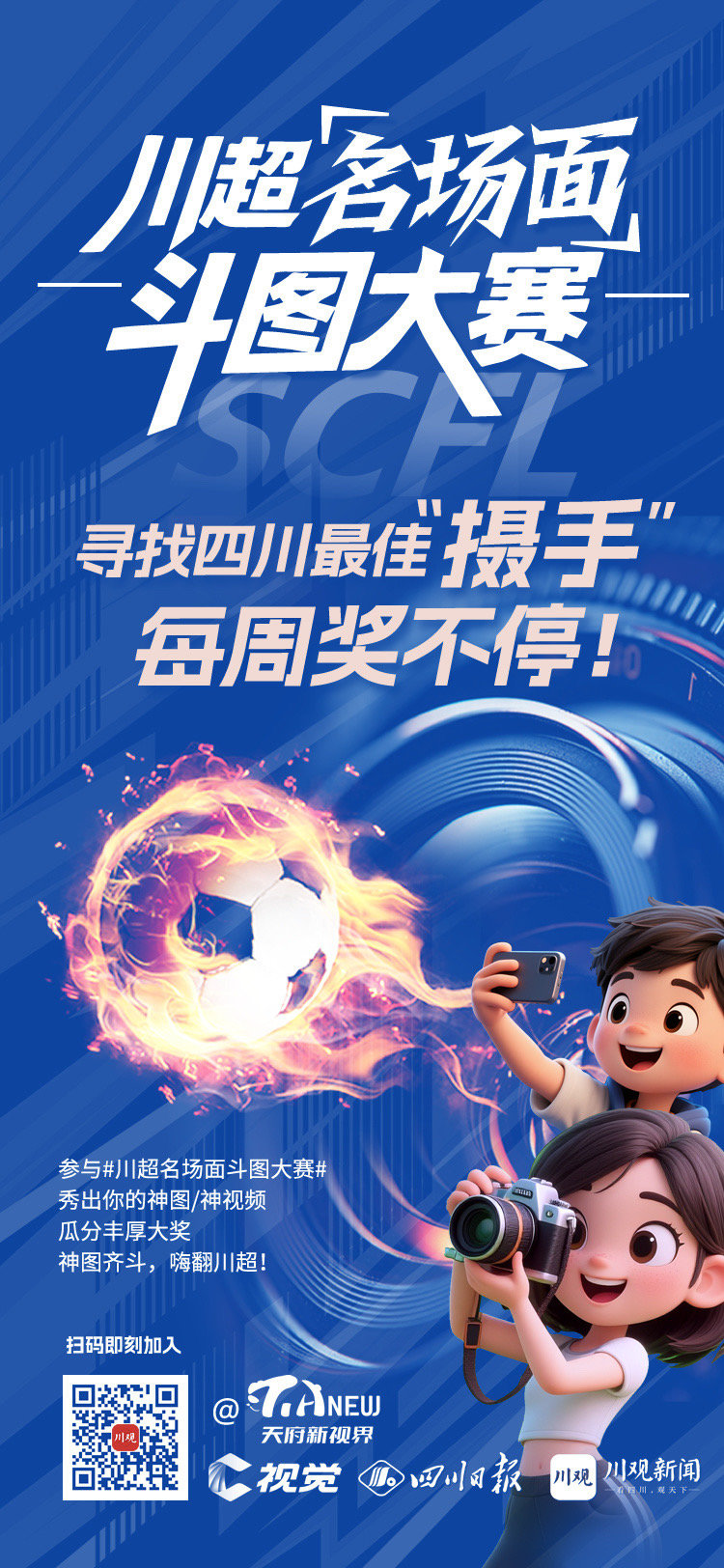 线下,绿茵场被赛事“点燃”。线上,“川超名场面斗图大赛”火热进行。不管你是观众、球员,还是游客、商家,川超赛事期间,都可以用镜头捕捉热血瞬间上传川观新闻,每周、每月参与评奖,年度终极大奖达10000元。