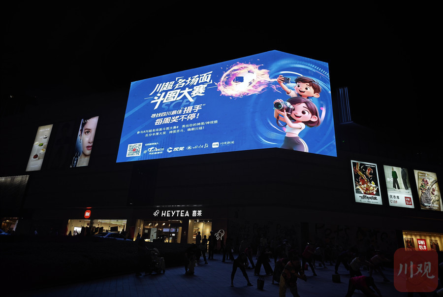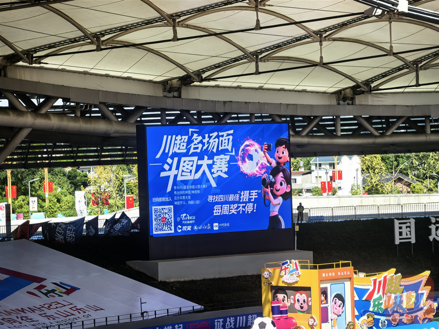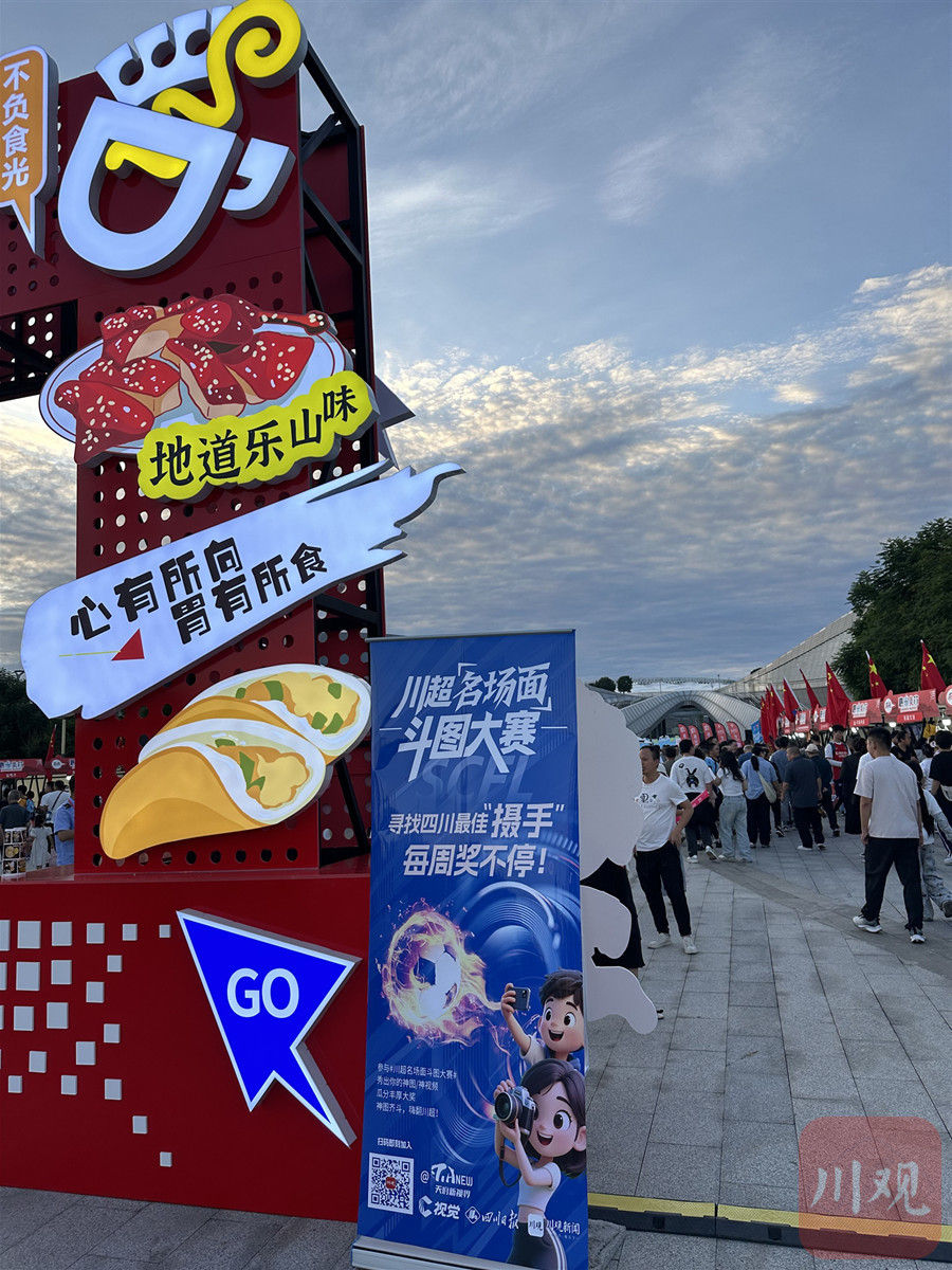 跟着赛事去旅行,由川观新闻发起的“川超名场面斗图大赛”也在乐山重磅登陆。从乐山奥林匹克中心绿茵场上的滚动大屏,到乐山主城区的世豪商圈8K屏幕,再到嘉州美食主题消费展,“川超名场面斗图大赛”宣传海报,在各场景都吸引了观众目光。