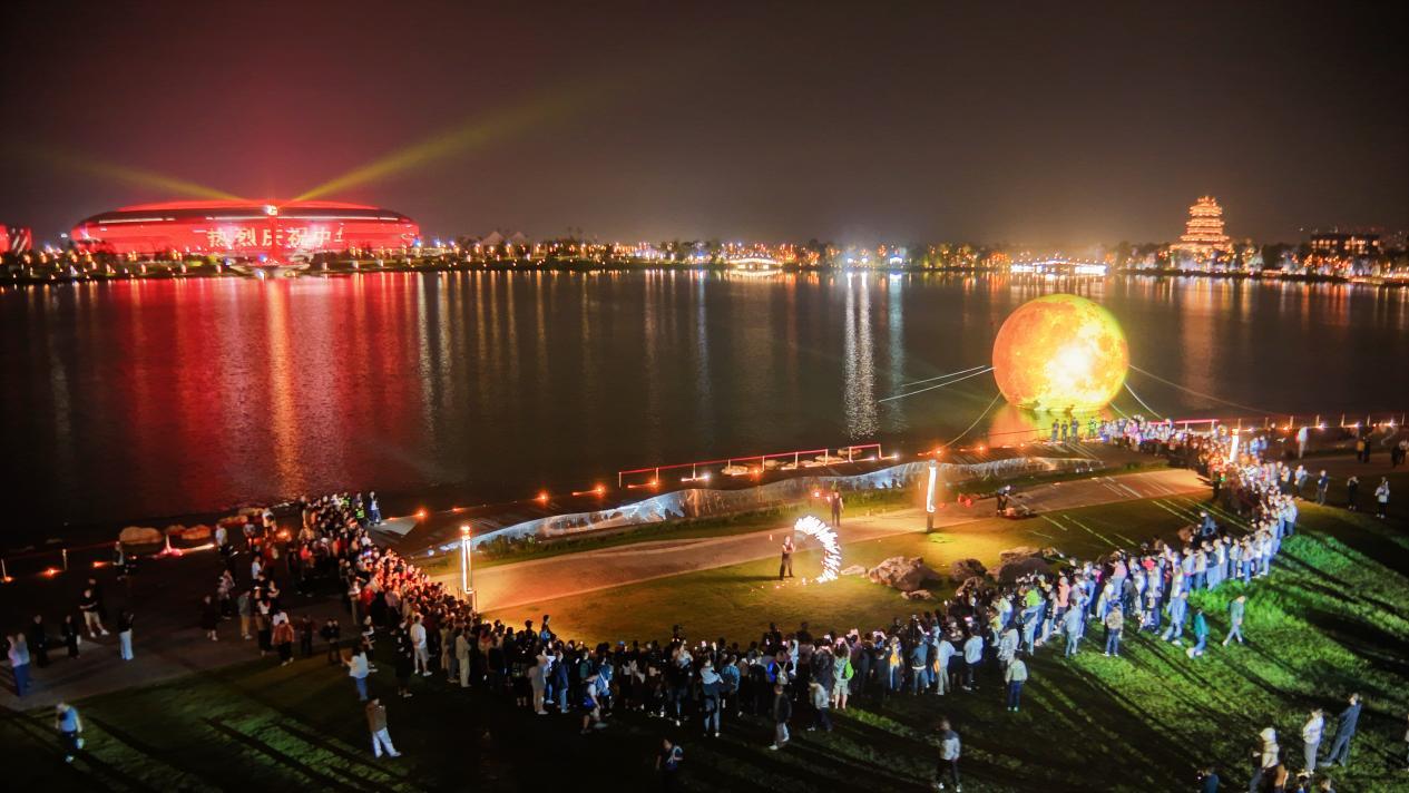 当晚,华灯初上,一场别开生面的开街仪式在东安堤启幕。以东安湖独具特色的湖心岛及相连的桥梁为天然舞台,“嫦娥”“玉兔”“杜甫”等身着华服,在桥上迤逦而行。舞蹈《共圆中国梦》、变脸吐火、非遗火壶、高空威亚《天女散花》等一场场表演,将节日氛围推向高潮。