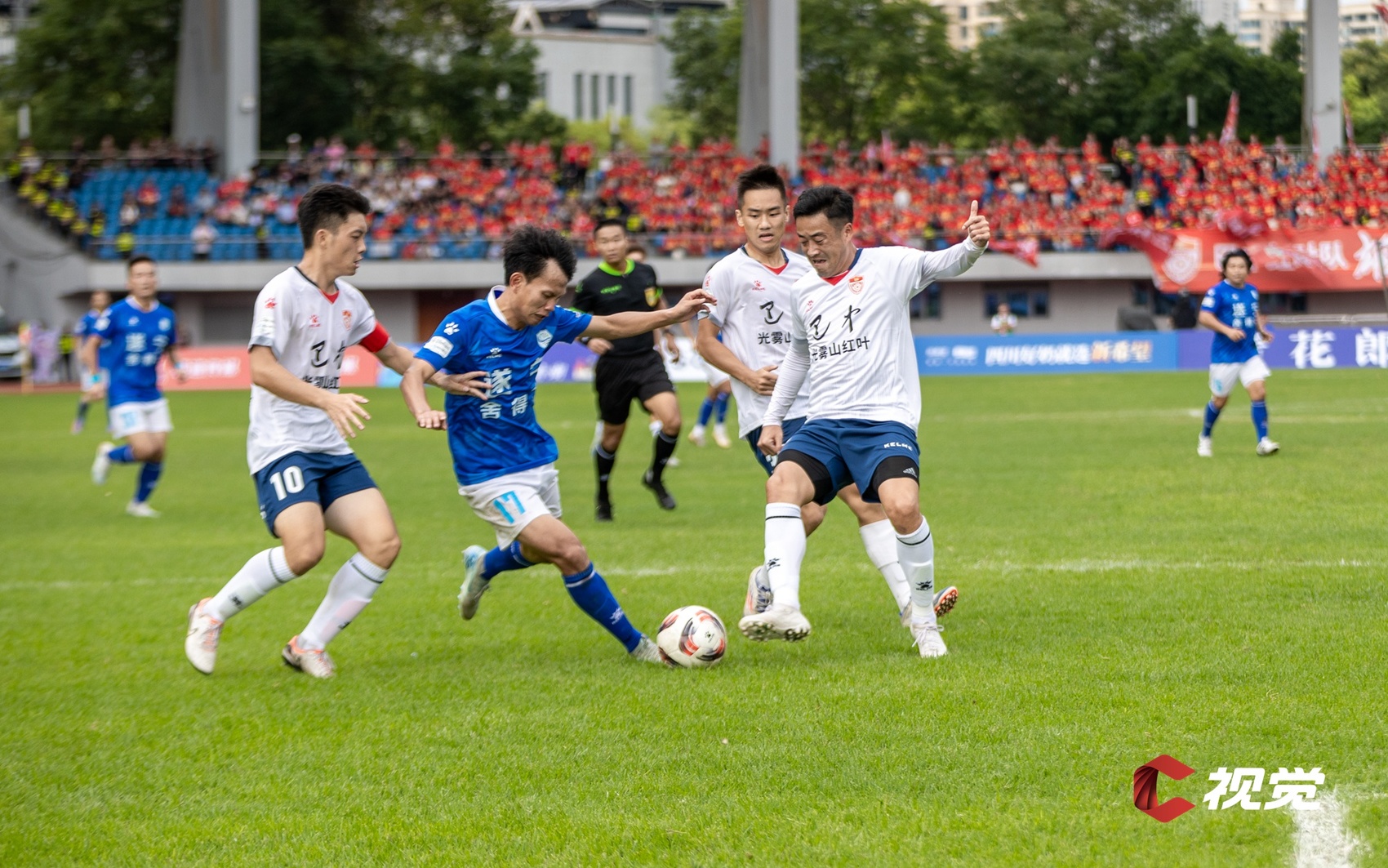 广安板楯蛮队与南充丝绸源点队球员在拼抢足球。(C视觉签约摄影师 刘秦君 摄)