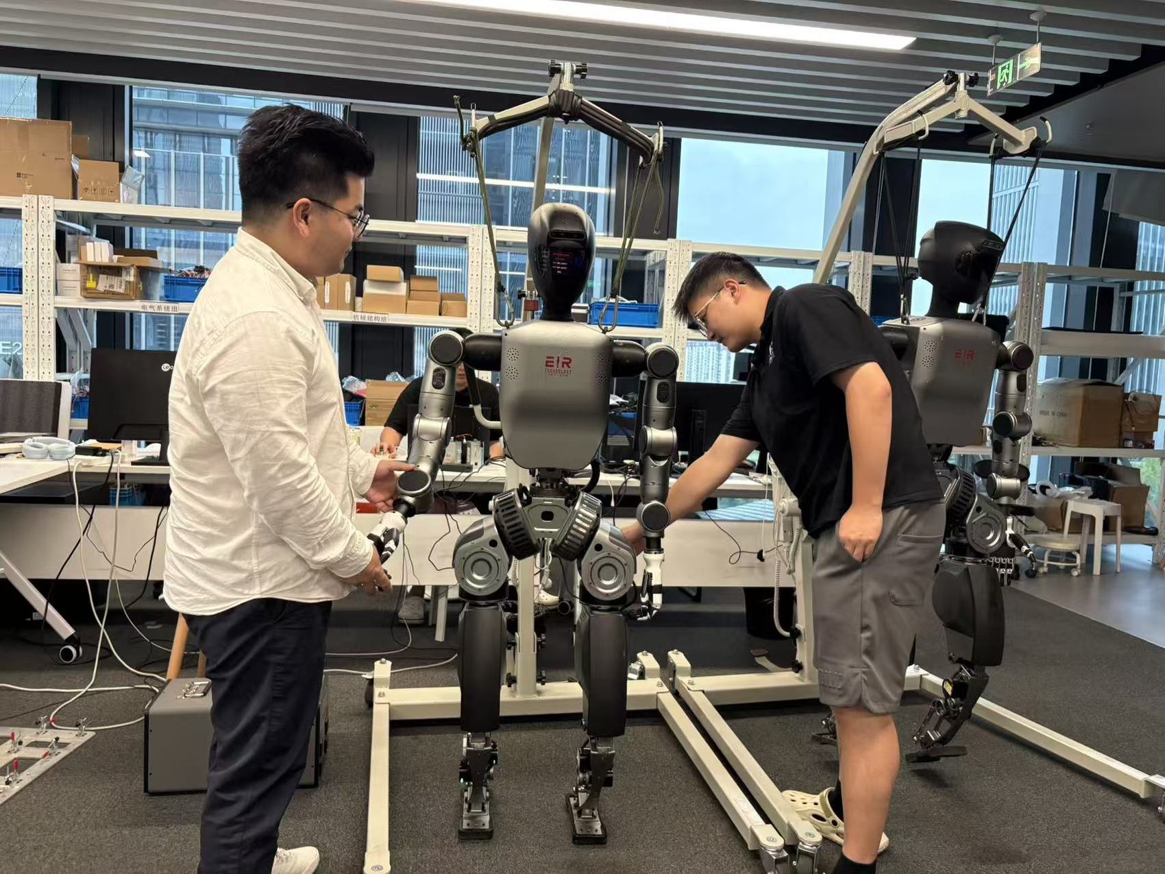 冯振宇(左)和同事调试机器人产品(图片由受访者提供)