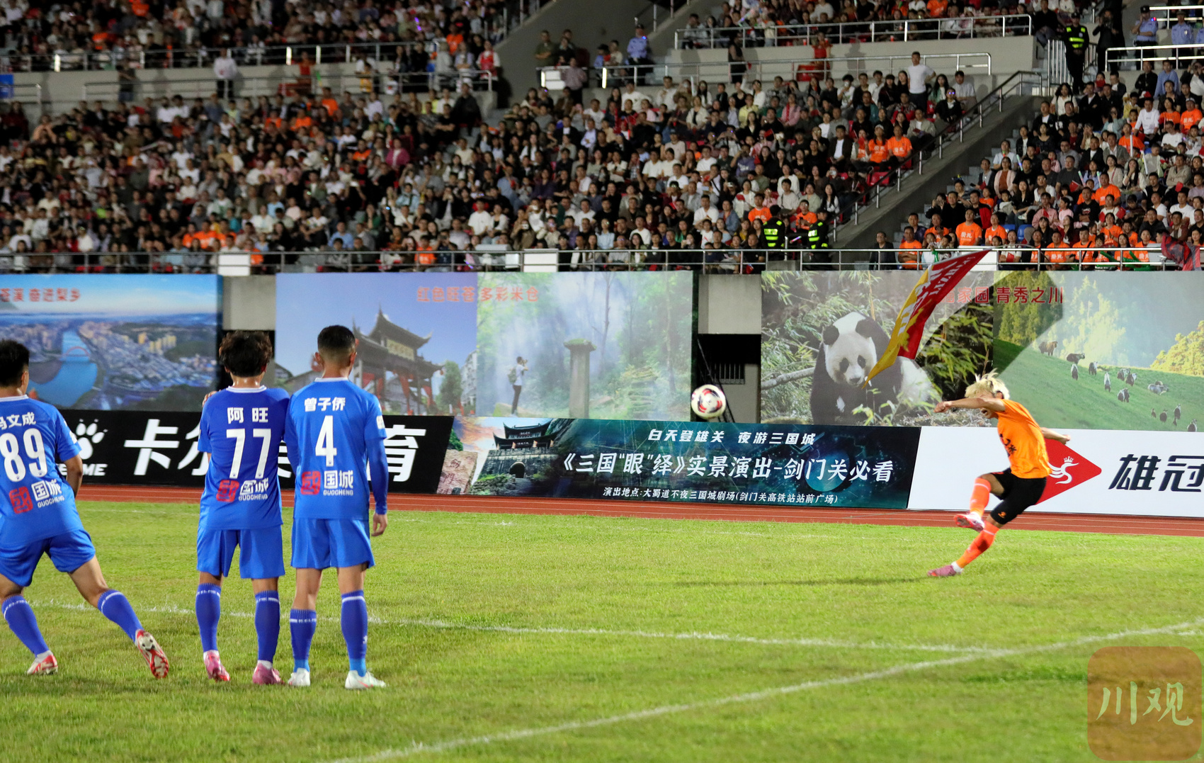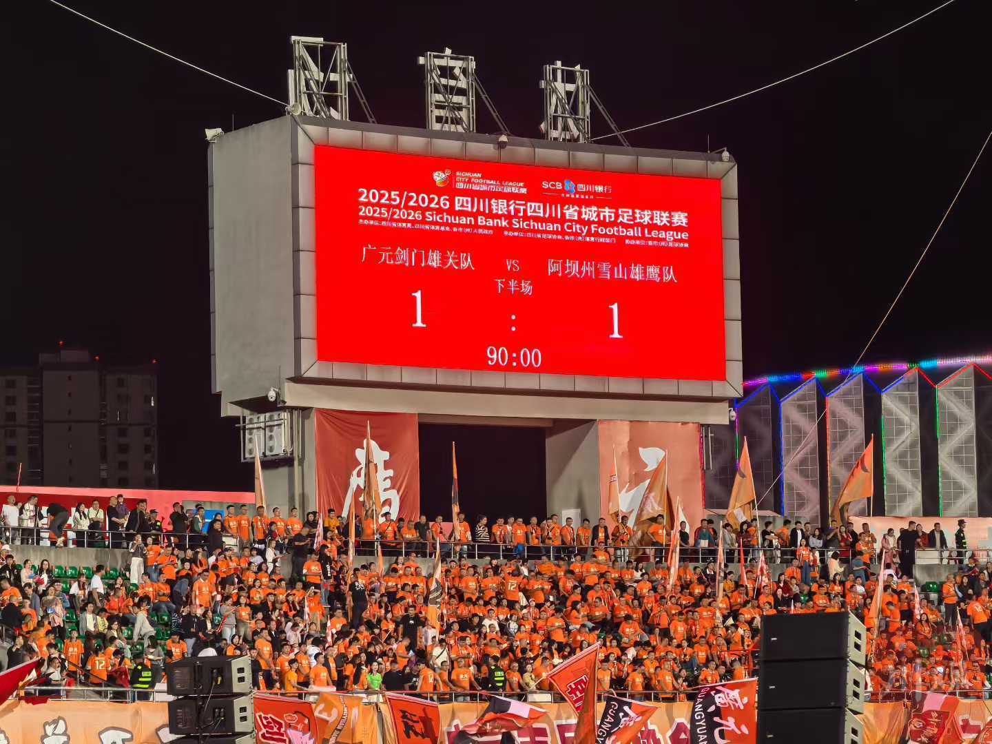 10月3日晚,广元澳源体育中心体育场内,灯光璀璨、热闹欢腾。这座能容纳2万人的球场,迎来了2025/2026四川银行四川省城市足球联赛(简称“川超”)的第二场比赛,由广元剑门雄关队主场迎战阿坝州雪山雄鹰队。这也是阿坝州队在“川超”比赛上的首秀。经过90多分钟激烈比赛,双方战成1:1平,各得1分。