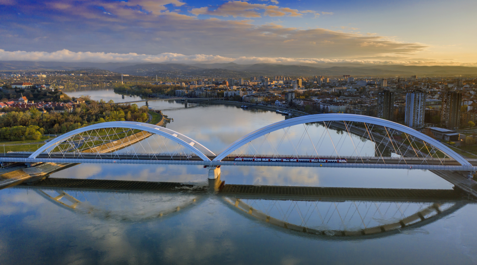 匈塞铁路塞尔维亚段,一列列车运行在诺维萨德多瑙河大桥上。