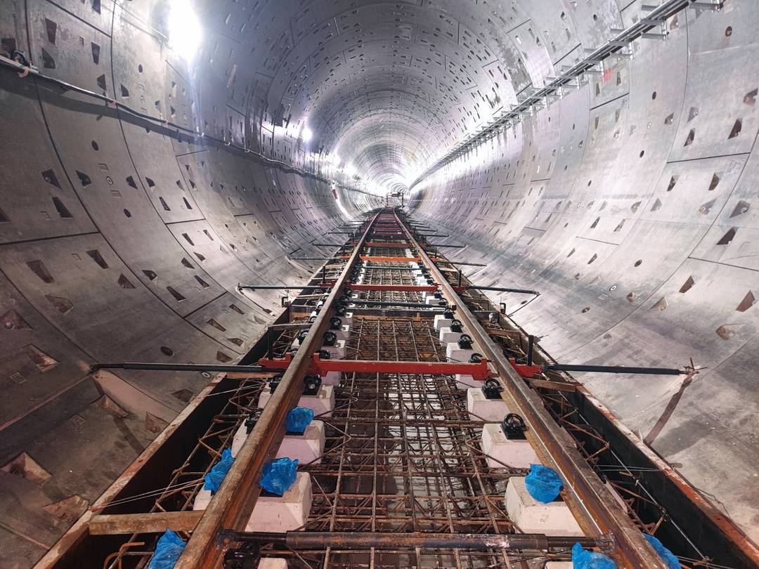据了解,该区间内已完成1公里的轨道铺设。为后续机电、装修等工程奠定了基础。正在现场检查的工作人员蒋力说:“每一根钢筋的间距、每一颗螺栓的扭矩,都必须精准。看着轨道一米米往前延伸,想到以后成千上万的乘客会在这条轨道上出行,真的很高兴。”