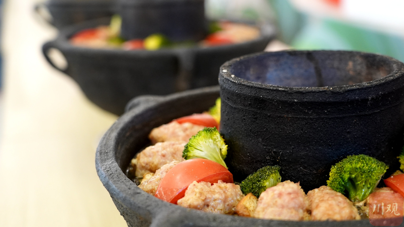 随后,高县土火锅烹饪制作技艺(省级非遗)代表性传承人邓全恩现场教授高县土火锅的烹饪技艺。按照高县土火锅“分层码菜、小火慢炖”的传统技法,将粉条、芋头、海带、土鸡、猪蹄等食材依次码放,同时结合当下年轻消费者对健康饮食的需求,适当调整了油脂用量,烹饪出更适合年轻人口味的土火锅。