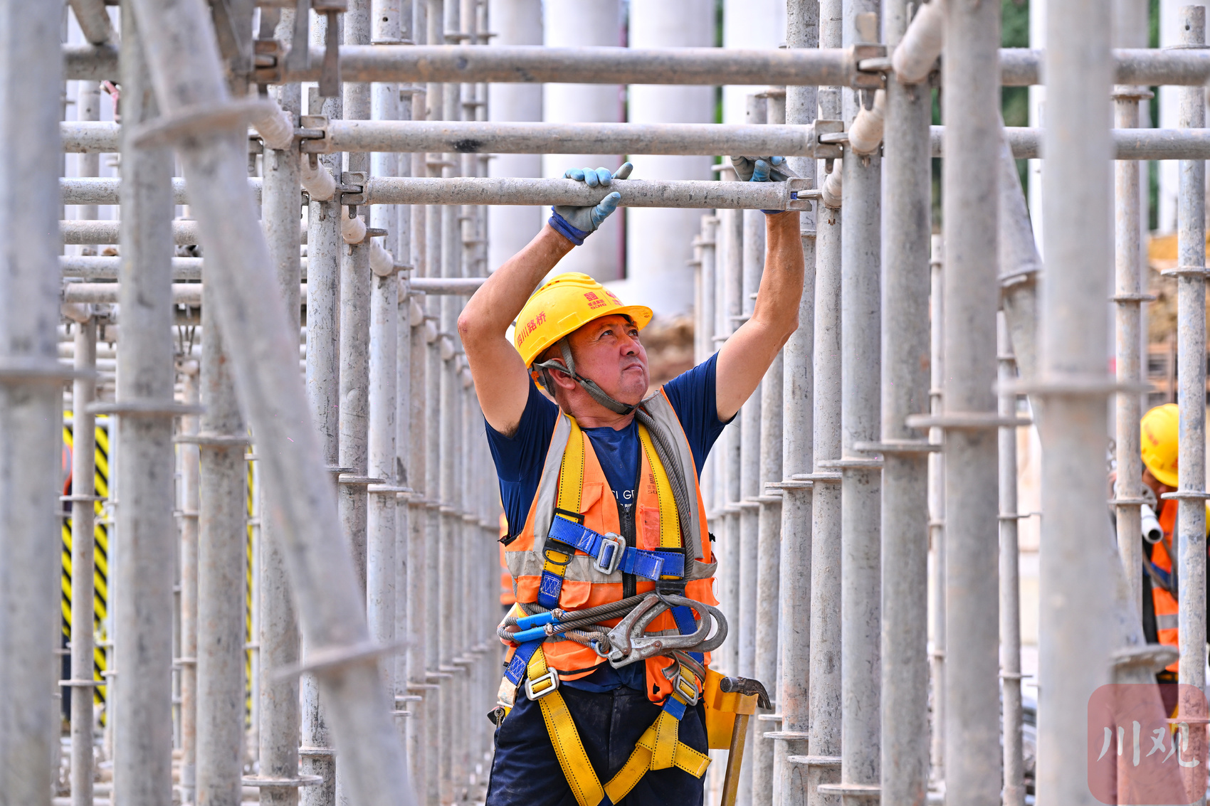 10月2日,在位于眉山市仁寿县宝飞镇的资乐高速公路建设现场,工人们坚守工作岗位加紧施工。(C视觉签约摄影师/潘帅)