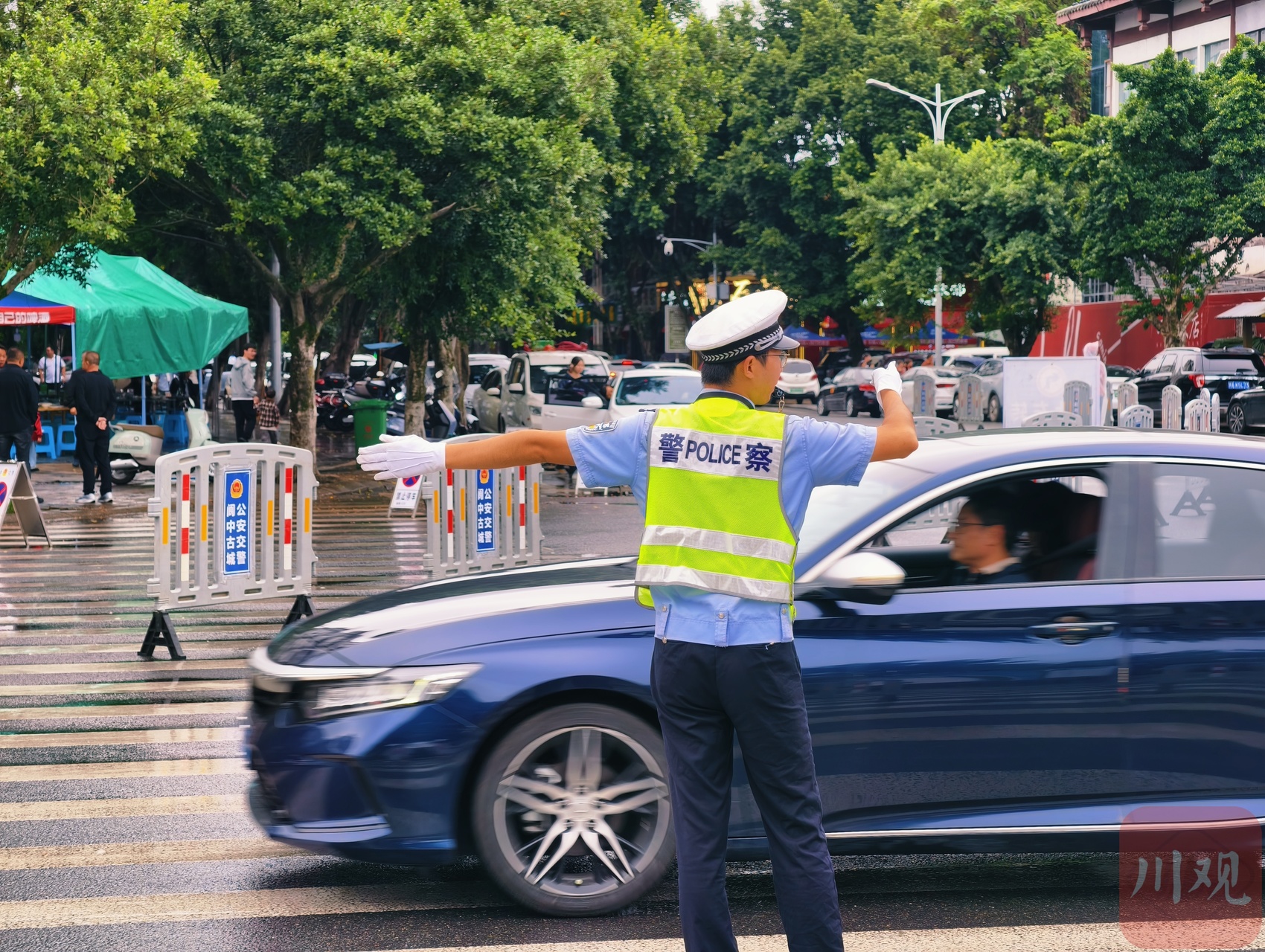 10月4日上午,在阆中市滨江路西段,阆中公安交警和青年志愿者正在指引车辆有序停放。(C视觉签约摄影师/张晓东)
